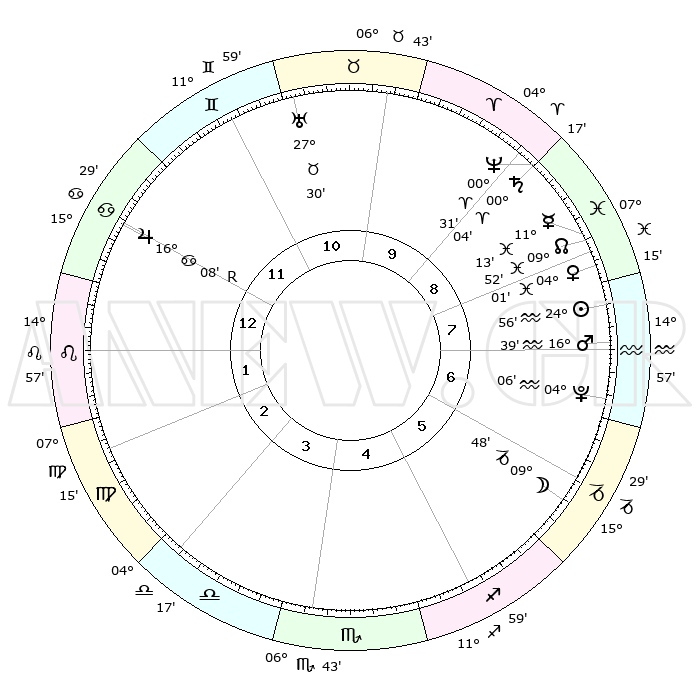 | | ΘΕΣΕΙΣ ΠΛΑΝΗΤΩΝ ΑΣΤΡΟΛΟΓΙΚΟΥ ΧΑΡΤΗ ΤΗΣ ΣΤΙΓΜΗΣ ΑΥΤΗΣ | | | | Πλανήτης | Ζώδιο | Μοίρες | Δεκαήμ. | Σε οίκο | Απόκλιση | | Ακμές των οίκων | | Ηλιος | Υδροχόος | 24°52' | Τρίτο | 8 | 13 S 14 | | 1ος | 26°59' | Καρκίνος | | Σελήνη | Αιγόκερως | 09°02' | Πρώτο | 6 | 27 S 40 | | 2ος | 17°50' | Λέων | | Ερμής | Ιχθείς | 11°07' | Δεύτερο | 8 | 07 S 38 | | 3ος | 12°28' | Παρθένος | | Αφροδίτη | Ιχθείς | 03°57' | Πρώτο | 8 | 11 S 26 | | 4ος | 13°07' | Ζυγός | | Αρης | Υδροχόος | 16°36' | Δεύτερο | 7 | 16 S 53 | | 5ος | 19°12' | Σκορπιός | | Δίας | Καρκίνος | 16°08'R | Δεύτερο | 12 | 22 N 47 | | 6ος | 25°25' | Τοξότης | | Κρόνος | Κριός | 00°04' | Πρώτο | 9 | 01 S 57 | | 7ος | 26°59' | Αιγόκερως | | Ουρανός | Ταύρος | 27°30' | Τρίτο | 11 | 19 N 25 | | 8ος | 17°50' | Υδροχόος | | Ποσειδώνας | Κριός | 00°31' | Πρώτο | 9 | 01 S 00 | | 9ος | 12°28' | Ιχθείς | | Πλούτωνας | Υδροχόος | 04°06' | Πρώτο | 7 | 22 S 57 | | 10ος | 13°07' | Κριός | | Β. Δεσμός | Ιχθείς | 09°52' | Πρώτο | 8 | 07 S 52 | | 11ος | 19°12' | Ταύρος | | Ωροσκόπος | Καρκίνος | 26°59' | Τρίτο | | | 12ος | 25°25' | Δίδυμοι | | Μεσουράνημα | Κριός | 13°07' | Δεύτερο | | | |