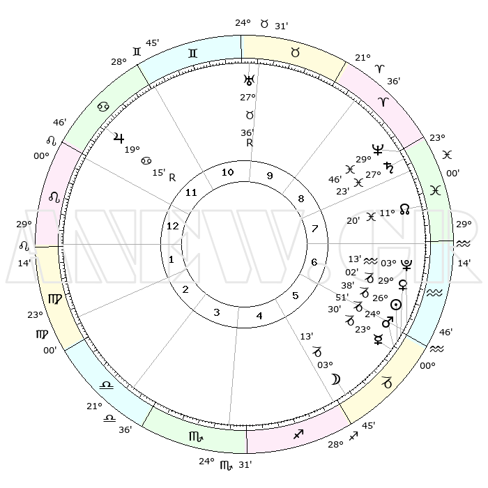 | | ΘΕΣΕΙΣ ΠΛΑΝΗΤΩΝ ΑΣΤΡΟΛΟΓΙΚΟΥ ΧΑΡΤΗ ΤΗΣ ΣΤΙΓΜΗΣ ΑΥΤΗΣ | | | | Πλανήτης | Ζώδιο | Μοίρες | Δεκαήμ. | Σε οίκο | Απόκλιση | | Ακμές των οίκων | | Ηλιος | Αιγόκερως | 26°32' | Τρίτο | 6 | 20 S 50 | | 1ος | 04°04' | Λέων | | Σελήνη | Αιγόκερως | 02°09' | Πρώτο | 5 | 28 S 10 | | 2ος | 25°24' | Λέων | | Ερμής | Αιγόκερως | 23°22' | Τρίτο | 6 | 23 S 16 | | 3ος | 21°00' | Παρθένος | | Αφροδίτη | Αιγόκερως | 28°56' | Τρίτο | 6 | 21 S 22 | | 4ος | 22°30' | Ζυγός | | Αρης | Αιγόκερως | 24°47' | Τρίτο | 6 | 22 S 08 | | 5ος | 28°25' | Σκορπιός | | Δίας | Καρκίνος | 19°15'R | Δεύτερο | 12 | 22 N 19 | | 6ος | 03°28' | Αιγόκερως | | Κρόνος | Ιχθείς | 27°23' | Τρίτο | 9 | 03 S 04 | | 7ος | 04°04' | Υδροχόος | | Ουρανός | Ταύρος | 27°36'R | Τρίτο | 10 | 19 N 26 | | 8ος | 25°24' | Υδροχόος | | Ποσειδώνας | Ιχθείς | 29°46' | Τρίτο | 9 | 01 S 18 | | 9ος | 21°00' | Ιχθείς | | Πλούτωνας | Υδροχόος | 03°13' | Πρώτο | 6 | 23 S 07 | | 10ος | 22°30' | Κριός | | Β. Δεσμός | Ιχθείς | 11°20' | Δεύτερο | 8 | 07 S 19 | | 11ος | 28°25' | Ταύρος | | Ωροσκόπος | Λέων | 04°04' | Πρώτο | | | 12ος | 03°28' | Καρκίνος | | Μεσουράνημα | Κριός | 22°30' | Τρίτο | | | |