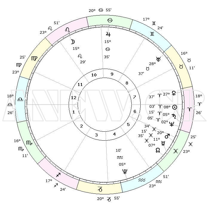 | | ΘΕΣΕΙΣ ΠΛΑΝΗΤΩΝ ΑΣΤΡΟΛΟΓΙΚΟΥ ΧΑΡΤΗ ΤΗΣ ΣΤΙΓΜΗΣ ΑΥΤΗΣ | | | | Πλανήτης | Ζώδιο | Μοίρες | Δεκαήμ. | Σε οίκο | Απόκλιση | | Ακμές των οίκων | | Ηλιος | Κριός | 07°59' | Πρώτο | 7 | 03 N 10 | | 1ος | 00°27' | Ζυγός | | Σελήνη | Λέων | 14°40' | Δεύτερο | 11 | 18 N 28 | | 2ος | 27°04' | Ζυγός | | Ερμής | Ιχθείς | 11°12' | Δεύτερο | 6 | 08 S 02 | | 3ος | 27°31' | Σκορπιός | | Αφροδίτη | Κριός | 27°33' | Τρίτο | 8 | 10 N 04 | | 4ος | 00°30' | Αιγόκερως | | Αρης | Ιχθείς | 20°31' | Τρίτο | 6 | 04 S 44 | | 5ος | 03°29' | Υδροχόος | | Δίας | Καρκίνος | 15°35' | Δεύτερο | 10 | 22 N 53 | | 6ος | 03°53' | Ιχθείς | | Κρόνος | Κριός | 05°15' | Πρώτο | 7 | 00 N 08 | | 7ος | 00°27' | Κριός | | Ουρανός | Ταύρος | 28°37' | Τρίτο | 9 | 19 N 41 | | 8ος | 27°04' | Κριός | | Ποσειδώνας | Κριός | 02°05' | Πρώτο | 7 | 00 S 22 | | 9ος | 27°31' | Ταύρος | | Πλούτωνας | Υδροχόος | 05°10' | Πρώτο | 5 | 22 S 48 | | 10ος | 00°30' | Καρκίνος | | Β. Δεσμός | Ιχθείς | 07°35' | Πρώτο | 6 | 08 S 43 | | 11ος | 03°28' | Λέων | | Ωροσκόπος | Ζυγός | 00°27' | Πρώτο | | | 12ος | 03°53' | Παρθένος | | Μεσουράνημα | Καρκίνος | 00°30' | Πρώτο | | | |