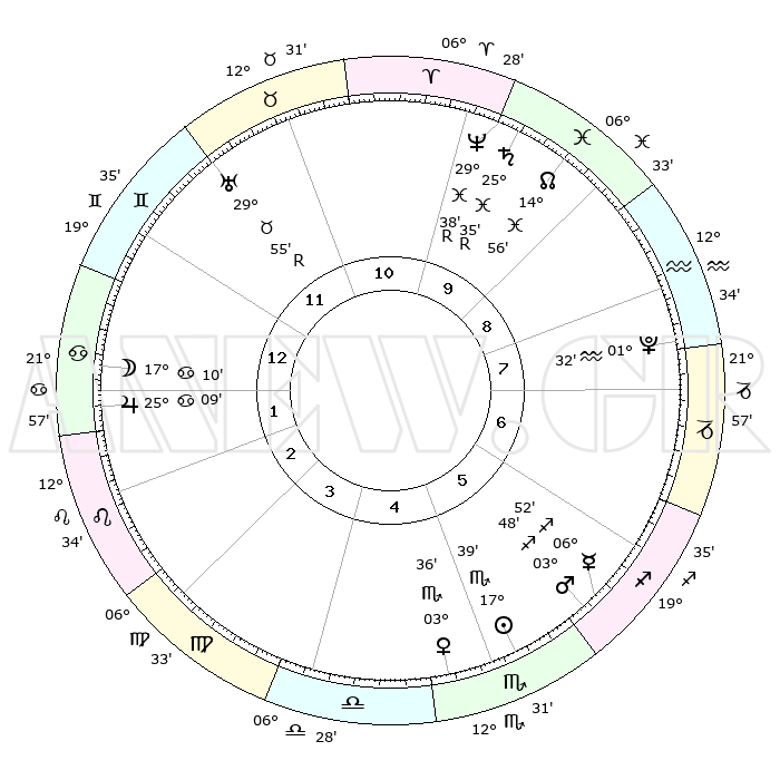 | | ΘΕΣΕΙΣ ΠΛΑΝΗΤΩΝ ΑΣΤΡΟΛΟΓΙΚΟΥ ΧΑΡΤΗ ΤΗΣ ΣΤΙΓΜΗΣ ΑΥΤΗΣ | | | | Πλανήτης | Ζώδιο | Μοίρες | Δεκαήμ. | Σε οίκο | Απόκλιση | | Ακμές των οίκων | | Ηλιος | Σκορπιός | 17°35' | Δεύτερο | 5 | 17 S 04 | | 1ος | 01°28' | Καρκίνος | | Σελήνη | Καρκίνος | 16°13' | Δεύτερο | 1 | 26 N 49 | | 2ος | 22°11' | Καρκίνος | | Ερμής | Τοξότης | 06°52' | Πρώτο | 6 | 23 S 47 | | 3ος | 14°05' | Λέων | | Αφροδίτη | Σκορπιός | 03°31' | Πρώτο | 5 | 11 S 26 | | 4ος | 10°38' | Παρθένος | | Αρης | Τοξότης | 03°45' | Πρώτο | 6 | 21 S 22 | | 5ος | 14°48' | Ζυγός | | Δίας | Καρκίνος | 25°09' | Τρίτο | 2 | 21 N 12 | | 6ος | 24°41' | Σκορπιός | | Κρόνος | Ιχθείς | 25°35'R | Τρίτο | 10 | 04 S 00 | | 7ος | 01°28' | Αιγόκερως | | Ουρανός | Ταύρος | 29°56'R | Τρίτο | 12 | 19 N 56 | | 8ος | 22°11' | Αιγόκερως | | Ποσειδώνας | Ιχθείς | 29°38'R | Τρίτο | 10 | 01 S 24 | | 9ος | 14°05' | Υδροχόος | | Πλούτωνας | Υδροχόος | 01°32' | Πρώτο | 8 | 23 S 29 | | 10ος | 10°38' | Ιχθείς | | Β. Δεσμός | Ιχθείς | 14°56' | Δεύτερο | 10 | 05 S 56 | | 11ος | 14°48' | Κριός | | Ωροσκόπος | Καρκίνος | 01°28' | Πρώτο | | | 12ος | 24°41' | Ταύρος | | Μεσουράνημα | Ιχθείς | 10°38' | Δεύτερο | | | |