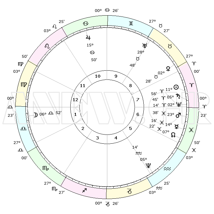 | | ΘΕΣΕΙΣ ΠΛΑΝΗΤΩΝ ΑΣΤΡΟΛΟΓΙΚΟΥ ΧΑΡΤΗ ΤΗΣ ΣΤΙΓΜΗΣ ΑΥΤΗΣ | | | | Πλανήτης | Ζώδιο | Μοίρες | Δεκαήμ. | Σε οίκο | Απόκλιση | | Ακμές των οίκων | | Ηλιος | Κριός | 11°52' | Δεύτερο | 8 | 04 N 42 | | 1ος | 12°12' | Παρθένος | | Σελήνη | Ζυγός | 06°05' | Πρώτο | 1 | 04 S 37 | | 2ος | 07°17' | Ζυγός | | Ερμής | Ιχθείς | 14°13' | Δεύτερο | 7 | 07 S 30 | | 3ος | 06°52' | Σκορπιός | | Αφροδίτη | Ταύρος | 02°23' | Πρώτο | 8 | 11 N 54 | | 4ος | 09°49' | Τοξότης | | Αρης | Ιχθείς | 23°36' | Τρίτο | 7 | 03 S 30 | | 5ος | 13°18' | Αιγόκερως | | Δίας | Καρκίνος | 15°49' | Δεύτερο | 11 | 22 N 52 | | 6ος | 14°29' | Υδροχόος | | Κρόνος | Κριός | 05°44' | Πρώτο | 7 | 00 N 19 | | 7ος | 12°12' | Ιχθείς | | Ουρανός | Ταύρος | 28°47' | Τρίτο | 9 | 19 N 43 | | 8ος | 07°17' | Κριός | | Ποσειδώνας | Κριός | 02°14' | Πρώτο | 7 | 00 S 19 | | 9ος | 06°52' | Ταύρος | | Πλούτωνας | Υδροχόος | 05°14' | Πρώτο | 5 | 22 S 47 | | 10ος | 09°49' | Δίδυμοι | | Β. Δεσμός | Ιχθείς | 07°22' | Πρώτο | 6 | 08 S 48 | | 11ος | 13°18' | Καρκίνος | | Ωροσκόπος | Παρθένος | 12°12' | Δεύτερο | | | 12ος | 14°29' | Λέων | | Μεσουράνημα | Δίδυμοι | 09°49' | Πρώτο | | | |