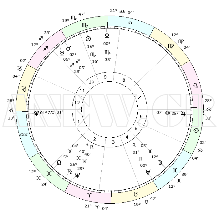 | | ΘΕΣΕΙΣ ΠΛΑΝΗΤΩΝ ΑΣΤΡΟΛΟΓΙΚΟΥ ΧΑΡΤΗ ΤΗΣ ΣΤΙΓΜΗΣ ΑΥΤΗΣ | | | | Πλανήτης | Ζώδιο | Μοίρες | Δεκαήμ. | Σε οίκο | Απόκλιση | | Ακμές των οίκων | | Ηλιος | Σκορπιός | 15°10' | Δεύτερο | 11 | 16 S 23 | | 1ος | 19°59' | Τοξότης | | Σελήνη | Δίδυμοι | 10°27' | Δεύτερο | 6 | 27 N 00 | | 2ος | 24°45' | Αιγόκερως | | Ερμής | Τοξότης | 06°27' | Πρώτο | 12 | 24 S 00 | | 3ος | 03°41' | Ιχθείς | | Αφροδίτη | Σκορπιός | 00°29' | Πρώτο | 10 | 10 S 21 | | 4ος | 08°58' | Κριός | | Αρης | Τοξότης | 02°00' | Πρώτο | 12 | 21 S 00 | | 5ος | 06°56' | Ταύρος | | Δίας | Καρκίνος | 25°07' | Τρίτο | 8 | 21 N 12 | | 6ος | 29°33' | Ταύρος | | Κρόνος | Ιχθείς | 25°40'R | Τρίτο | 3 | 03 S 58 | | 7ος | 19°59' | Δίδυμοι | | Ουρανός | Δίδυμοι | 00°01'R | Πρώτο | 6 | 19 N 57 | | 8ος | 24°45' | Καρκίνος | | Ποσειδώνας | Ιχθείς | 29°40'R | Τρίτο | 3 | 01 S 23 | | 9ος | 03°41' | Παρθένος | | Πλούτωνας | Υδροχόος | 01°30' | Πρώτο | 2 | 23 S 30 | | 10ος | 08°58' | Ζυγός | | Β. Δεσμός | Ιχθείς | 15°04' | Δεύτερο | 3 | 05 S 53 | | 11ος | 06°56' | Σκορπιός | | Ωροσκόπος | Τοξότης | 19°59' | Δεύτερο | | | 12ος | 29°33' | Σκορπιός | | Μεσουράνημα | Ζυγός | 08°58' | Πρώτο | | | |