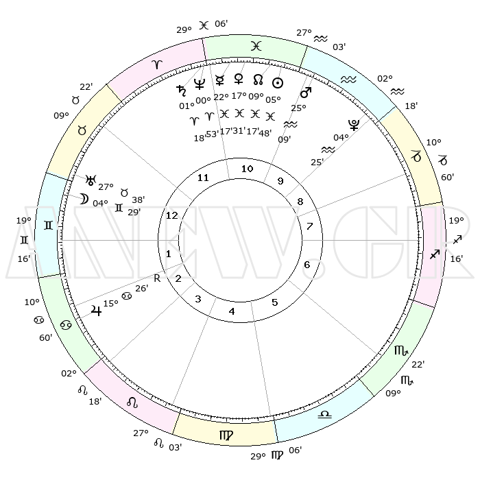 | | ΘΕΣΕΙΣ ΠΛΑΝΗΤΩΝ ΑΣΤΡΟΛΟΓΙΚΟΥ ΧΑΡΤΗ ΤΗΣ ΣΤΙΓΜΗΣ ΑΥΤΗΣ | | | | Πλανήτης | Ζώδιο | Μοίρες | Δεκαήμ. | Σε οίκο | Απόκλιση | | Ακμές των οίκων | | Ηλιος | Ιχθείς | 05°45' | Πρώτο | 11 | 09 S 24 | | 1ος | 27°40' | Ταύρος | | Σελήνη | Δίδυμοι | 03°43' | Πρώτο | 1 | 26 N 03 | | 2ος | 22°57' | Δίδυμοι | | Ερμής | Ιχθείς | 22°16' | Τρίτο | 11 | 00 S 55 | | 3ος | 14°28' | Καρκίνος | | Αφροδίτη | Ιχθείς | 17°27' | Δεύτερο | 11 | 06 S 16 | | 4ος | 07°04' | Λέων | | Αρης | Υδροχόος | 25°06' | Τρίτο | 10 | 14 S 11 | | 5ος | 05°08' | Παρθένος | | Δίας | Καρκίνος | 15°26'R | Δεύτερο | 3 | 22 N 53 | | 6ος | 13°12' | Ζυγός | | Κρόνος | Κριός | 01°17' | Πρώτο | 11 | 01 S 27 | | 7ος | 27°40' | Σκορπιός | | Ουρανός | Ταύρος | 27°38' | Τρίτο | 12 | 19 N 27 | | 8ος | 22°57' | Τοξότης | | Ποσειδώνας | Κριός | 00°53' | Πρώτο | 11 | 00 S 51 | | 9ος | 14°28' | Αιγόκερως | | Πλούτωνας | Υδροχόος | 04°25' | Πρώτο | 9 | 22 S 54 | | 10ος | 07°04' | Υδροχόος | | Β. Δεσμός | Ιχθείς | 09°17' | Πρώτο | 11 | 08 S 05 | | 11ος | 05°08' | Ιχθείς | | Ωροσκόπος | Ταύρος | 27°40' | Τρίτο | | | 12ος | 13°12' | Κριός | | Μεσουράνημα | Υδροχόος | 07°04' | Πρώτο | | | |