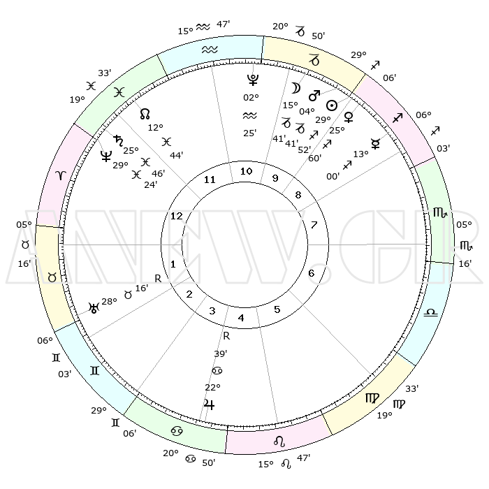 | | ΘΕΣΕΙΣ ΠΛΑΝΗΤΩΝ ΑΣΤΡΟΛΟΓΙΚΟΥ ΧΑΡΤΗ ΤΗΣ ΣΤΙΓΜΗΣ ΑΥΤΗΣ | | | | Πλανήτης | Ζώδιο | Μοίρες | Δεκαήμ. | Σε οίκο | Απόκλιση | | Ακμές των οίκων | | Ηλιος | Τοξότης | 29°49' | Τρίτο | 9 | 23 S 26 | | 1ος | 03°12' | Κριός | | Σελήνη | Αιγόκερως | 14°59' | Δεύτερο | 10 | 26 S 45 | | 2ος | 12°43' | Ταύρος | | Ερμής | Τοξότης | 12°56' | Δεύτερο | 9 | 21 S 38 | | 3ος | 09°38' | Δίδυμοι | | Αφροδίτη | Τοξότης | 25°56' | Τρίτο | 9 | 23 S 28 | | 4ος | 01°48' | Καρκίνος | | Αρης | Αιγόκερως | 04°39' | Πρώτο | 10 | 24 S 10 | | 5ος | 24°15' | Καρκίνος | | Δίας | Καρκίνος | 22°40'R | Τρίτο | 4 | 21 N 44 | | 6ος | 22°09' | Λέων | | Κρόνος | Ιχθείς | 25°46' | Τρίτο | 12 | 03 S 48 | | 7ος | 03°12' | Ζυγός | | Ουρανός | Ταύρος | 28°16'R | Τρίτο | 2 | 19 N 34 | | 8ος | 12°43' | Σκορπιός | | Ποσειδώνας | Ιχθείς | 29°24' | Τρίτο | 12 | 01 S 28 | | 9ος | 09°38' | Τοξότης | | Πλούτωνας | Υδροχόος | 02°25' | Πρώτο | 11 | 23 S 17 | | 10ος | 01°48' | Αιγόκερως | | Β. Δεσμός | Ιχθείς | 12°44' | Δεύτερο | 12 | 06 S 47 | | 11ος | 24°15' | Αιγόκερως | | Ωροσκόπος | Κριός | 03°12' | Πρώτο | | | 12ος | 22°09' | Υδροχόος | | Μεσουράνημα | Αιγόκερως | 01°48' | Πρώτο | | | |