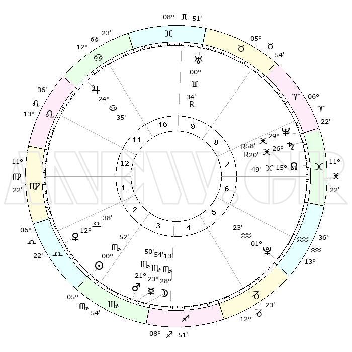 | ΘΕΣΕΙΣ ΠΛΑΝΗΤΩΝ ΑΣΤΡΟΛΟΓΙΚΟΥ ΧΑΡΤΗ ΤΗΣ ΣΤΙΓΜΗΣ ΑΥΤΗΣ | | Πλανήτης | Ζώδιο | Μοίρες | Δεκαήμ. | Σε οίκο | Απόκλιση | | Ακμές των οίκων | Ηλιος | Σκορπιός | 00°43' | Πρώτο | 4 | 11 S 43 | | 1ος | 26°18' | Καρκίνος | Σελήνη | Σκορπιός | 26°23' | Τρίτο | 5 | 24 S 00 | | 2ος | 17°07' | Λέων | Ερμής | Σκορπιός | 23°43' | Τρίτο | 5 | 21 S 10 | | 3ος | 11°40' | Παρθένος | Αφροδίτη | Ζυγός | 12°26' | Δεύτερο | 4 | 03 S 30 | | 4ος | 12°13' | Ζυγός | Αρης | Σκορπιός | 21°43' | Τρίτο | 5 | 18 S 30 | | 5ος | 18°19' | Σκορπιός | Δίας | Καρκίνος | 24°35' | Τρίτο | 12 | 21 N 16 | | 6ος | 24°38' | Τοξότης | Κρόνος | Ιχθείς | 26°20'R | Τρίτο | 9 | 03 S 44 | | 7ος | 26°18' | Αιγόκερως | Ουρανός | Δίδυμοι | 00°34'R | Πρώτο | 11 | 20 N 04 | | 8ος | 17°07' | Υδροχόος | Ποσειδώνας | Ιχθείς | 29°58'R | Τρίτο | 9 | 01 S 16 | | 9ος | 11°40' | Ιχθείς | Πλούτωνας | Υδροχόος | 01°23' | Πρώτο | 7 | 23 S 32 | | 10ος | 12°13' | Κριός | Β. Δεσμός | Ιχθείς | 15°50' | Δεύτερο | 9 | 05 S 35 | | 11ος | 18°19' | Ταύρος | Ωροσκόπος | Καρκίνος | 26°18' | Τρίτο | | | 12ος | 24°38' | Δίδυμοι | Μεσουράνημα | Κριός | 12°13' | Δεύτερο | | | |