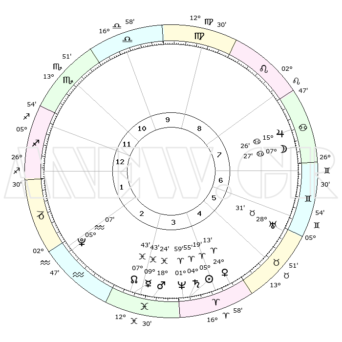 | | ΘΕΣΕΙΣ ΠΛΑΝΗΤΩΝ ΑΣΤΡΟΛΟΓΙΚΟΥ ΧΑΡΤΗ ΤΗΣ ΣΤΙΓΜΗΣ ΑΥΤΗΣ | | | | Πλανήτης | Ζώδιο | Μοίρες | Δεκαήμ. | Σε οίκο | Απόκλιση | | Ακμές των οίκων | | Ηλιος | Κριός | 05°15' | Πρώτο | 4 | 02 N 05 | | 1ος | 04°33' | Τοξότης | | Σελήνη | Καρκίνος | 06°27' | Πρώτο | 8 | 27 N 54 | | 2ος | 06°21' | Αιγόκερως | | Ερμής | Ιχθείς | 09°41' | Πρώτο | 3 | 08 S 06 | | 3ος | 12°50' | Υδροχόος | | Αφροδίτη | Κριός | 24°08' | Τρίτο | 5 | 08 N 43 | | 4ος | 18°55' | Ιχθείς | | Αρης | Ιχθείς | 18°21' | Δεύτερο | 3 | 05 S 35 | | 5ος | 19°21' | Κριός | | Δίας | Καρκίνος | 15°26' | Δεύτερο | 8 | 22 N 54 | | 6ος | 13°47' | Ταύρος | | Κρόνος | Κριός | 04°54' | Πρώτο | 4 | 00 S 00 | | 7ος | 04°33' | Δίδυμοι | | Ουρανός | Ταύρος | 28°31' | Τρίτο | 6 | 19 N 39 | | 8ος | 06°21' | Καρκίνος | | Ποσειδώνας | Κριός | 01°59' | Πρώτο | 4 | 00 S 25 | | 9ος | 12°50' | Λέων | | Πλούτωνας | Υδροχόος | 05°07' | Πρώτο | 2 | 22 S 48 | | 10ος | 18°55' | Παρθένος | | Β. Δεσμός | Ιχθείς | 07°44' | Πρώτο | 3 | 08 S 40 | | 11ος | 19°21' | Ζυγός | | Ωροσκόπος | Τοξότης | 04°33' | Πρώτο | | | 12ος | 13°47' | Σκορπιός | | Μεσουράνημα | Παρθένος | 18°55' | Δεύτερο | | | |