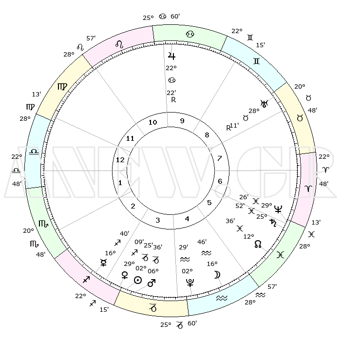 | | ΘΕΣΕΙΣ ΠΛΑΝΗΤΩΝ ΑΣΤΡΟΛΟΓΙΚΟΥ ΧΑΡΤΗ ΤΗΣ ΣΤΙΓΜΗΣ ΑΥΤΗΣ | | | | Πλανήτης | Ζώδιο | Μοίρες | Δεκαήμ. | Σε οίκο | Απόκλιση | | Ακμές των οίκων | | Ηλιος | Αιγόκερως | 02°20' | Πρώτο | 4 | 23 S 25 | | 1ος | 27°16' | Παρθένος | | Σελήνη | Υδροχόος | 15°40' | Δεύτερο | 5 | 18 S 14 | | 2ος | 23°39' | Ζυγός | | Ερμής | Τοξότης | 16°32' | Δεύτερο | 3 | 22 S 22 | | 3ος | 23°59' | Σκορπιός | | Αφροδίτη | Τοξότης | 29°03' | Τρίτο | 4 | 23 S 37 | | 4ος | 26°56' | Τοξότης | | Αρης | Αιγόκερως | 06°32' | Πρώτο | 4 | 24 S 07 | | 5ος | 29°57' | Αιγόκερως | | Δίας | Καρκίνος | 22°22'R | Τρίτο | 10 | 21 N 48 | | 6ος | 00°29' | Ιχθείς | | Κρόνος | Ιχθείς | 25°52' | Τρίτο | 6 | 03 S 44 | | 7ος | 27°16' | Ιχθείς | | Ουρανός | Ταύρος | 28°11'R | Τρίτο | 9 | 19 N 33 | | 8ος | 23°39' | Κριός | | Ποσειδώνας | Ιχθείς | 29°26' | Τρίτο | 7 | 01 S 27 | | 9ος | 23°59' | Ταύρος | | Πλούτωνας | Υδροχόος | 02°29' | Πρώτο | 5 | 23 S 16 | | 10ος | 26°56' | Δίδυμοι | | Β. Δεσμός | Ιχθείς | 12°36' | Δεύτερο | 6 | 06 S 50 | | 11ος | 29°57' | Καρκίνος | | Ωροσκόπος | Παρθένος | 27°16' | Τρίτο | | | 12ος | 00°29' | Παρθένος | | Μεσουράνημα | Δίδυμοι | 26°56' | Τρίτο | | | |