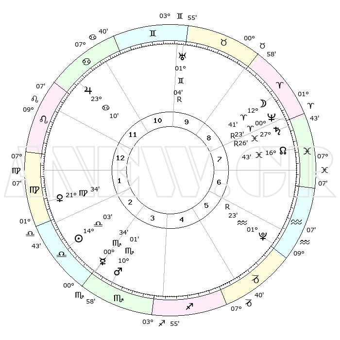| ΘΕΣΕΙΣ ΠΛΑΝΗΤΩΝ ΑΣΤΡΟΛΟΓΙΚΟΥ ΧΑΡΤΗ ΤΗΣ ΣΤΙΓΜΗΣ ΑΥΤΗΣ | | Πλανήτης | Ζώδιο | Μοίρες | Δεκαήμ. | Σε οίκο | Απόκλιση | | Ακμές των οίκων | Ηλιος | Ζυγός | 13°57' | Δεύτερο | 3 | 05 S 30 | | 1ος | 08°30' | Λέων | Σελήνη | Κριός | 11°13' | Δεύτερο | 9 | 06 N 19 | | 2ος | 00°12' | Παρθένος | Ερμής | Σκορπιός | 00°25' | Πρώτο | 4 | 12 S 23 | | 3ος | 26°23' | Παρθένος | Αφροδίτη | Παρθένος | 21°26' | Τρίτο | 2 | 04 N 41 | | 4ος | 28°20' | Ζυγός | Αρης | Σκορπιός | 09°57' | Πρώτο | 4 | 14 S 56 | | 5ος | 04°02' | Τοξότης | Δίας | Καρκίνος | 23°09' | Τρίτο | 12 | 21 N 29 | | 6ος | 08°24' | Αιγόκερως | Κρόνος | Ιχθείς | 27°27'R | Τρίτο | 9 | 03 S 19 | | 7ος | 08°30' | Υδροχόος | Ουρανός | Δίδυμοι | 01°04'R | Πρώτο | 10 | 20 N 10 | | 8ος | 00°12' | Ιχθείς | Ποσειδώνας | Κριός | 00°23'R | Πρώτο | 9 | 01 S 06 | | 9ος | 26°23' | Ιχθείς | Πλούτωνας | Υδροχόος | 01°23'R | Πρώτο | 6 | 23 S 32 | | 10ος | 28°20' | Κριός | Β. Δεσμός | Ιχθείς | 16°44' | Δεύτερο | 8 | 05 S 14 | | 11ος | 04°02' | Δίδυμοι | Ωροσκόπος | Λέων | 08°30' | Πρώτο | | | 12ος | 08°24' | Καρκίνος | Μεσουράνημα | Κριός | 28°20' | Τρίτο | | | |