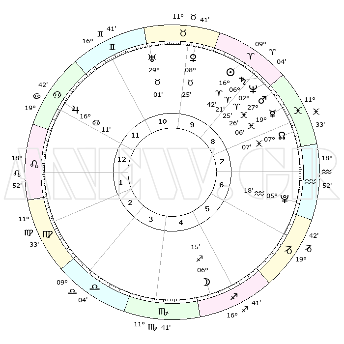 | | ΘΕΣΕΙΣ ΠΛΑΝΗΤΩΝ ΑΣΤΡΟΛΟΓΙΚΟΥ ΧΑΡΤΗ ΤΗΣ ΣΤΙΓΜΗΣ ΑΥΤΗΣ | | | | Πλανήτης | Ζώδιο | Μοίρες | Δεκαήμ. | Σε οίκο | Απόκλιση | | Ακμές των οίκων | | Ηλιος | Κριός | 16°39' | Δεύτερο | 9 | 06 N 33 | | 1ος | 01°33' | Λέων | | Σελήνη | Τοξότης | 05°32' | Πρώτο | 5 | 26 S 18 | | 2ος | 22°42' | Λέων | | Ερμής | Ιχθείς | 19°02' | Δεύτερο | 9 | 06 S 12 | | 3ος | 17°57' | Παρθένος | | Αφροδίτη | Ταύρος | 08°21' | Πρώτο | 10 | 14 N 05 | | 4ος | 19°10' | Ζυγός | | Αρης | Ιχθείς | 27°23' | Τρίτο | 9 | 01 S 59 | | 5ος | 25°11' | Σκορπιός | | Δίας | Καρκίνος | 16°11' | Δεύτερο | 12 | 22 N 50 | | 6ος | 00°38' | Αιγόκερως | | Κρόνος | Κριός | 06°20' | Πρώτο | 9 | 00 N 33 | | 7ος | 01°33' | Υδροχόος | | Ουρανός | Ταύρος | 29°01' | Τρίτο | 11 | 19 N 46 | | 8ος | 22°42' | Υδροχόος | | Ποσειδώνας | Κριός | 02°25' | Πρώτο | 9 | 00 S 15 | | 9ος | 17°57' | Ιχθείς | | Πλούτωνας | Υδροχόος | 05°18' | Πρώτο | 7 | 22 S 47 | | 10ος | 19°10' | Κριός | | Β. Δεσμός | Ιχθείς | 07°07' | Πρώτο | 8 | 08 S 54 | | 11ος | 25°11' | Ταύρος | | Ωροσκόπος | Λέων | 01°33' | Πρώτο | | | 12ος | 00°38' | Καρκίνος | | Μεσουράνημα | Κριός | 19°10' | Δεύτερο | | | |