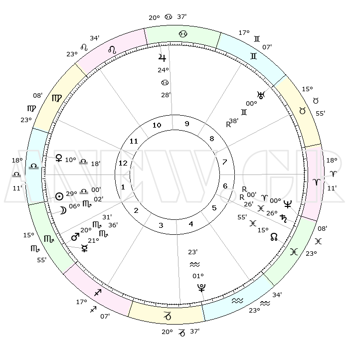 | ΘΕΣΕΙΣ ΠΛΑΝΗΤΩΝ ΑΣΤΡΟΛΟΓΙΚΟΥ ΧΑΡΤΗ ΤΗΣ ΣΤΙΓΜΗΣ ΑΥΤΗΣ | | Πλανήτης | Ζώδιο | Μοίρες | Δεκαήμ. | Σε οίκο | Απόκλιση | | Ακμές των οίκων | Ηλιος | Ζυγός | 28°40' | Τρίτο | 5 | 11 S 00 | | 1ος | 09°58' | Καρκίνος | Σελήνη | Σκορπιός | 02°03' | Πρώτο | 5 | 15 S 34 | | 2ος | 00°24' | Λέων | Ερμής | Σκορπιός | 21°11' | Τρίτο | 5 | 20 S 21 | | 3ος | 23°01' | Λέων | Αφροδίτη | Ζυγός | 09°53' | Πρώτο | 4 | 02 S 30 | | 4ος | 20°59' | Παρθένος | Αρης | Σκορπιός | 20°17' | Τρίτο | 5 | 18 S 06 | | 5ος | 26°16' | Ζυγός | Δίας | Καρκίνος | 24°27' | Τρίτο | 1 | 21 N 17 | | 6ος | 05°12' | Τοξότης | Κρόνος | Ιχθείς | 26°27'R | Τρίτο | 10 | 03 S 42 | | 7ος | 09°58' | Αιγόκερως | Ουρανός | Δίδυμοι | 00°38'R | Πρώτο | 11 | 20 N 04 | | 8ος | 00°24' | Υδροχόος | Ποσειδώνας | Κριός | 00°01'R | Πρώτο | 10 | 01 S 15 | | 9ος | 23°01' | Υδροχόος | Πλούτωνας | Υδροχόος | 01°23' | Πρώτο | 8 | 23 S 32 | | 10ος | 20°59' | Ιχθείς | Β. Δεσμός | Ιχθείς | 15°56' | Δεύτερο | 9 | 05 S 33 | | 11ος | 26°16' | Κριός | Ωροσκόπος | Καρκίνος | 09°58' | Πρώτο | | | 12ος | 05°12' | Δίδυμοι | Μεσουράνημα | Ιχθείς | 20°59' | Τρίτο | | | |
