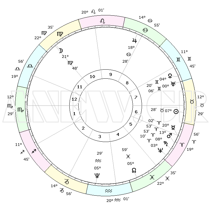 | | ΘΕΣΕΙΣ ΠΛΑΝΗΤΩΝ ΑΣΤΡΟΛΟΓΙΚΟΥ ΧΑΡΤΗ ΤΗΣ ΣΤΙΓΜΗΣ ΑΥΤΗΣ | | | | Πλανήτης | Ζώδιο | Μοίρες | Δεκαήμ. | Σε οίκο | Απόκλιση | | Ακμές των οίκων | | Ηλιος | Ταύρος | 07°25' | Πρώτο | 7 | 13 N 59 | | 1ος | 24°56' | Ζυγός | | Σελήνη | Παρθένος | 21°02' | Τρίτο | 11 | 02 N 27 | | 2ος | 23°03' | Σκορπιός | | Ερμής | Κριός | 19°56' | Δεύτερο | 6 | 05 N 43 | | 3ος | 24°38' | Τοξότης | | Αφροδίτη | Δίδυμοι | 04°16' | Πρώτο | 8 | 21 N 44 | | 4ος | 28°30' | Αιγόκερως | | Αρης | Κριός | 13°50' | Δεύτερο | 6 | 04 N 37 | | 5ος | 01°27' | Ιχθείς | | Δίας | Καρκίνος | 18°28' | Δεύτερο | 9 | 22 N 33 | | 6ος | 00°33' | Κριός | | Κρόνος | Κριός | 08°53' | Πρώτο | 6 | 01 N 32 | | 7ος | 24°56' | Κριός | | Ουρανός | Δίδυμοι | 00°06' | Πρώτο | 8 | 20 N 00 | | 8ος | 23°03' | Ταύρος | | Ποσειδώνας | Κριός | 03°09' | Πρώτο | 6 | 00 N 03 | | 9ος | 24°38' | Δίδυμοι | | Πλούτωνας | Υδροχόος | 05°29' | Πρώτο | 4 | 22 S 48 | | 10ος | 28°30' | Καρκίνος | | Β. Δεσμός | Ιχθείς | 05°59' | Πρώτο | 5 | 09 S 19 | | 11ος | 01°27' | Παρθένος | | Ωροσκόπος | Ζυγός | 24°56' | Τρίτο | | | 12ος | 00°33' | Ζυγός | | Μεσουράνημα | Καρκίνος | 28°30' | Τρίτο | | | |