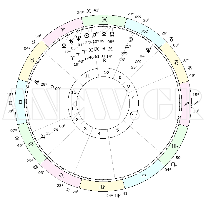 | | ΘΕΣΕΙΣ ΠΛΑΝΗΤΩΝ ΑΣΤΡΟΛΟΓΙΚΟΥ ΧΑΡΤΗ ΤΗΣ ΣΤΙΓΜΗΣ ΑΥΤΗΣ | | | | Πλανήτης | Ζώδιο | Μοίρες | Δεκαήμ. | Σε οίκο | Απόκλιση | | Ακμές των οίκων | | Ηλιος | Ιχθείς | 25°42' | Τρίτο | 11 | 01 S 42 | | 1ος | 18°06' | Ταύρος | | Σελήνη | Υδροχόος | 21°04' | Τρίτο | 10 | 16 S 01 | | 2ος | 15°34' | Δίδυμοι | | Ερμής | Ιχθείς | 09°33'R | Πρώτο | 11 | 06 S 02 | | 3ος | 07°36' | Καρκίνος | | Αφροδίτη | Κριός | 12°14' | Δεύτερο | 12 | 03 N 54 | | 4ος | 29°41' | Καρκίνος | | Αρης | Ιχθείς | 10°48' | Δεύτερο | 11 | 08 S 31 | | 5ος | 26°16' | Λέων | | Δίας | Καρκίνος | 15°08' | Δεύτερο | 3 | 22 N 56 | | 6ος | 02°35' | Ζυγός | | Κρόνος | Κριός | 03°42' | Πρώτο | 12 | 00 S 29 | | 7ος | 18°06' | Σκορπιός | | Ουρανός | Ταύρος | 28°09' | Τρίτο | 1 | 19 N 34 | | 8ος | 15°34' | Τοξότης | | Ποσειδώνας | Κριός | 01°37' | Πρώτο | 11 | 00 S 33 | | 9ος | 07°36' | Αιγόκερως | | Πλούτωνας | Υδροχόος | 04°55' | Πρώτο | 10 | 22 S 49 | | 10ος | 29°41' | Αιγόκερως | | Β. Δεσμός | Ιχθείς | 08°14' | Πρώτο | 11 | 08 S 29 | | 11ος | 26°16' | Υδροχόος | | Ωροσκόπος | Ταύρος | 18°06' | Δεύτερο | | | 12ος | 02°35' | Κριός | | Μεσουράνημα | Αιγόκερως | 29°41' | Τρίτο | | | |