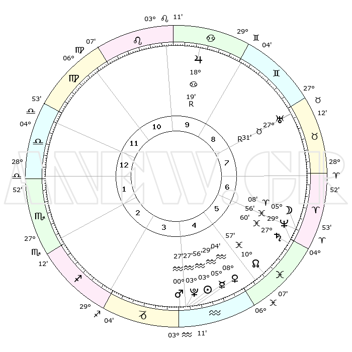 | | ΘΕΣΕΙΣ ΠΛΑΝΗΤΩΝ ΑΣΤΡΟΛΟΓΙΚΟΥ ΧΑΡΤΗ ΤΗΣ ΣΤΙΓΜΗΣ ΑΥΤΗΣ | | | | Πλανήτης | Ζώδιο | Μοίρες | Δεκαήμ. | Σε οίκο | Απόκλιση | | Ακμές των οίκων | | Ηλιος | Υδροχόος | 03°52' | Πρώτο | 4 | 19 S 17 | | 1ος | 07°41' | Ζυγός | | Σελήνη | Κριός | 04°09' | Πρώτο | 6 | 03 N 39 | | 2ος | 04°48' | Σκορπιός | | Ερμής | Υδροχόος | 05°22' | Πρώτο | 4 | 20 S 57 | | 3ος | 05°32' | Τοξότης | | Αφροδίτη | Υδροχόος | 07°59' | Πρώτο | 4 | 19 S 26 | | 4ος | 08°39' | Αιγόκερως | | Αρης | Υδροχόος | 00°23' | Πρώτο | 4 | 21 S 03 | | 5ος | 11°35' | Υδροχόος | | Δίας | Καρκίνος | 18°19'R | Δεύτερο | 10 | 22 N 28 | | 6ος | 11°42' | Ιχθείς | | Κρόνος | Ιχθείς | 27°60' | Τρίτο | 6 | 02 S 49 | | 7ος | 07°41' | Κριός | | Ουρανός | Ταύρος | 27°31'R | Τρίτο | 8 | 19 N 25 | | 8ος | 04°48' | Ταύρος | | Ποσειδώνας | Ιχθείς | 29°56' | Τρίτο | 6 | 01 S 14 | | 9ος | 05°32' | Δίδυμοι | | Πλούτωνας | Υδροχόος | 03°27' | Πρώτο | 4 | 23 S 04 | | 10ος | 08°39' | Καρκίνος | | Β. Δεσμός | Ιχθείς | 10°57' | Δεύτερο | 5 | 07 S 27 | | 11ος | 11°35' | Λέων | | Ωροσκόπος | Ζυγός | 07°41' | Πρώτο | | | 12ος | 11°42' | Παρθένος | | Μεσουράνημα | Καρκίνος | 08°39' | Πρώτο | | | |
