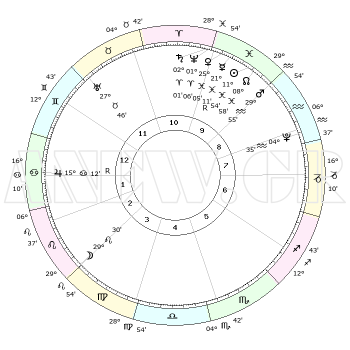 | | ΘΕΣΕΙΣ ΠΛΑΝΗΤΩΝ ΑΣΤΡΟΛΟΓΙΚΟΥ ΧΑΡΤΗ ΤΗΣ ΣΤΙΓΜΗΣ ΑΥΤΗΣ | | | | Πλανήτης | Ζώδιο | Μοίρες | Δεκαήμ. | Σε οίκο | Απόκλιση | | Ακμές των οίκων | | Ηλιος | Ιχθείς | 11°50' | Δεύτερο | 10 | 07 S 07 | | 1ος | 24°04' | Δίδυμοι | | Σελήνη | Λέων | 28°34' | Τρίτο | 3 | 12 N 52 | | 2ος | 15°18' | Καρκίνος | | Ερμής | Ιχθείς | 21°14'R | Τρίτο | 10 | 00 S 16 | | 3ος | 06°47' | Λέων | | Αφροδίτη | Ιχθείς | 24°60' | Τρίτο | 10 | 03 S 13 | | 4ος | 02°11' | Παρθένος | | Αρης | Υδροχόος | 29°52' | Τρίτο | 9 | 12 S 32 | | 5ος | 05°07' | Ζυγός | | Δίας | Καρκίνος | 15°13'R | Δεύτερο | 1 | 22 N 55 | | 6ος | 15°23' | Σκορπιός | | Κρόνος | Κριός | 02°00' | Πρώτο | 10 | 01 S 09 | | 7ος | 24°04' | Τοξότης | | Ουρανός | Ταύρος | 27°46' | Τρίτο | 12 | 19 N 29 | | 8ος | 15°18' | Αιγόκερως | | Ποσειδώνας | Κριός | 01°06' | Πρώτο | 10 | 00 S 46 | | 9ος | 06°47' | Υδροχόος | | Πλούτωνας | Υδροχόος | 04°34' | Πρώτο | 8 | 22 S 52 | | 10ος | 02°11' | Ιχθείς | | Β. Δεσμός | Ιχθείς | 08°58' | Πρώτο | 10 | 08 S 12 | | 11ος | 05°07' | Κριός | | Ωροσκόπος | Δίδυμοι | 24°04' | Τρίτο | | | 12ος | 15°23' | Ταύρος | | Μεσουράνημα | Ιχθείς | 02°11' | Πρώτο | | | |