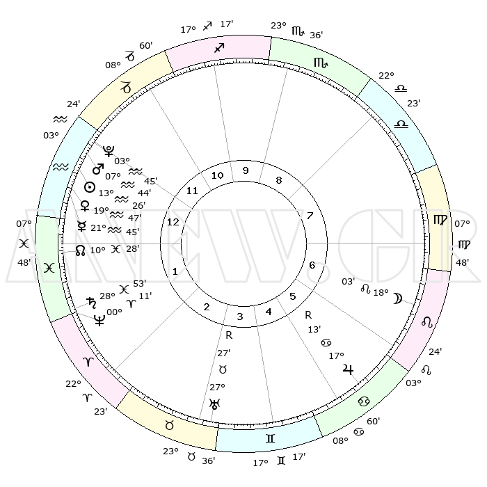 | | ΘΕΣΕΙΣ ΠΛΑΝΗΤΩΝ ΑΣΤΡΟΛΟΓΙΚΟΥ ΧΑΡΤΗ ΤΗΣ ΣΤΙΓΜΗΣ ΑΥΤΗΣ | | | | Πλανήτης | Ζώδιο | Μοίρες | Δεκαήμ. | Σε οίκο | Απόκλιση | | Ακμές των οίκων | | Ηλιος | Υδροχόος | 13°21' | Δεύτερο | 1 | 16 S 48 | | 1ος | 01°31' | Υδροχόος | | Σελήνη | Λέων | 17°02' | Δεύτερο | 7 | 17 N 36 | | 2ος | 15°52' | Ιχθείς | | Ερμής | Υδροχόος | 21°37' | Τρίτο | 1 | 16 S 00 | | 3ος | 24°04' | Κριός | | Αφροδίτη | Υδροχόος | 19°42' | Δεύτερο | 1 | 16 S 13 | | 4ος | 22°16' | Ταύρος | | Αρης | Υδροχόος | 07°41' | Πρώτο | 1 | 19 S 21 | | 5ος | 14°56' | Δίδυμοι | | Δίας | Καρκίνος | 17°13'R | Δεύτερο | 6 | 22 N 38 | | 6ος | 06°24' | Καρκίνος | | Κρόνος | Ιχθείς | 28°53' | Τρίτο | 2 | 02 S 26 | | 7ος | 01°31' | Λέων | | Ουρανός | Ταύρος | 27°28'R | Τρίτο | 4 | 19 N 24 | | 8ος | 15°52' | Παρθένος | | Ποσειδώνας | Κριός | 00°11' | Πρώτο | 2 | 01 S 08 | | 9ος | 24°04' | Ζυγός | | Πλούτωνας | Υδροχόος | 03°44' | Πρώτο | 1 | 23 S 01 | | 10ος | 22°17' | Σκορπιός | | Β. Δεσμός | Ιχθείς | 10°28' | Δεύτερο | 1 | 07 S 39 | | 11ος | 14°56' | Τοξότης | | Ωροσκόπος | Υδροχόος | 01°31' | Πρώτο | | | 12ος | 06°24' | Αιγόκερως | | Μεσουράνημα | Σκορπιός | 22°17' | Τρίτο | | | |