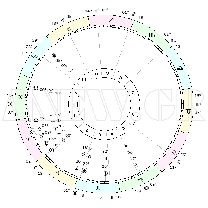 | | ΘΕΣΕΙΣ ΠΛΑΝΗΤΩΝ ΑΣΤΡΟΛΟΓΙΚΟΥ ΧΑΡΤΗ ΤΗΣ ΣΤΙΓΜΗΣ ΑΥΤΗΣ | | | | Πλανήτης | Ζώδιο | Μοίρες | Δεκαήμ. | Σε οίκο | Απόκλιση | | Ακμές των οίκων | | Ηλιος | Ταύρος | 00°55' | Πρώτο | 3 | 11 N 48 | | 1ος | 08°13' | Υδροχόος | | Σελήνη | Δίδυμοι | 19°43' | Δεύτερο | 4 | 28 N 00 | | 2ος | 23°25' | Ιχθείς | | Ερμής | Κριός | 08°47' | Πρώτο | 2 | 01 N 05 | | 3ος | 00°27' | Ταύρος | | Αφροδίτη | Ταύρος | 26°10' | Τρίτο | 3 | 19 N 43 | | 4ος | 27°34' | Ταύρος | | Αρης | Κριός | 08°42' | Πρώτο | 2 | 02 N 34 | | 5ος | 19°49' | Δίδυμοι | | Δίας | Καρκίνος | 17°38' | Δεύτερο | 6 | 22 N 39 | | 6ος | 11°37' | Καρκίνος | | Κρόνος | Κριός | 08°06' | Πρώτο | 2 | 01 N 14 | | 7ος | 08°13' | Λέων | | Ουρανός | Ταύρος | 29°44' | Τρίτο | 4 | 19 N 56 | | 8ος | 23°25' | Παρθένος | | Ποσειδώνας | Κριός | 02°56' | Πρώτο | 2 | 00 S 02 | | 9ος | 00°27' | Σκορπιός | | Πλούτωνας | Υδροχόος | 05°27' | Πρώτο | 12 | 22 S 48 | | 10ος | 27°34' | Σκορπιός | | Β. Δεσμός | Ιχθείς | 06°21' | Πρώτο | 1 | 09 S 11 | | 11ος | 19°49' | Τοξότης | | Ωροσκόπος | Υδροχόος | 08°13' | Πρώτο | | | 12ος | 11°37' | Αιγόκερως | | Μεσουράνημα | Σκορπιός | 27°34' | Τρίτο | | | |