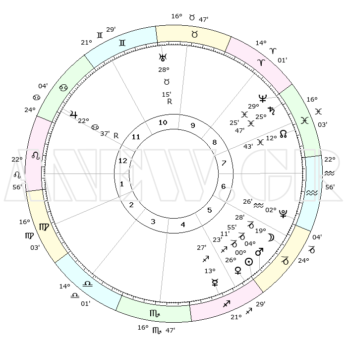 | | ΘΕΣΕΙΣ ΠΛΑΝΗΤΩΝ ΑΣΤΡΟΛΟΓΙΚΟΥ ΧΑΡΤΗ ΤΗΣ ΣΤΙΓΜΗΣ ΑΥΤΗΣ | | | | Πλανήτης | Ζώδιο | Μοίρες | Δεκαήμ. | Σε οίκο | Απόκλιση | | Ακμές των οίκων | | Ηλιος | Αιγόκερως | 00°06' | Πρώτο | 6 | 23 S 26 | | 1ος | 00°23' | Λέων | | Σελήνη | Αιγόκερως | 18°31' | Δεύτερο | 6 | 26 S 08 | | 2ος | 21°26' | Λέων | | Ερμής | Τοξότης | 13°21' | Δεύτερο | 5 | 21 S 44 | | 3ος | 16°32' | Παρθένος | | Αφροδίτη | Τοξότης | 26°17' | Τρίτο | 5 | 23 S 29 | | 4ος | 17°37' | Ζυγός | | Αρης | Αιγόκερως | 04°52' | Πρώτο | 6 | 24 S 10 | | 5ος | 23°39' | Σκορπιός | | Δίας | Καρκίνος | 22°38'R | Τρίτο | 12 | 21 N 45 | | 6ος | 29°18' | Τοξότης | | Κρόνος | Ιχθείς | 25°46' | Τρίτο | 9 | 03 S 47 | | 7ος | 00°23' | Υδροχόος | | Ουρανός | Ταύρος | 28°16'R | Τρίτο | 11 | 19 N 34 | | 8ος | 21°26' | Υδροχόος | | Ποσειδώνας | Ιχθείς | 29°25' | Τρίτο | 9 | 01 S 28 | | 9ος | 16°32' | Ιχθείς | | Πλούτωνας | Υδροχόος | 02°25' | Πρώτο | 7 | 23 S 17 | | 10ος | 17°37' | Κριός | | Β. Δεσμός | Ιχθείς | 12°43' | Δεύτερο | 8 | 06 S 47 | | 11ος | 23°39' | Ταύρος | | Ωροσκόπος | Λέων | 00°23' | Πρώτο | | | 12ος | 29°18' | Δίδυμοι | | Μεσουράνημα | Κριός | 17°37' | Δεύτερο | | | |