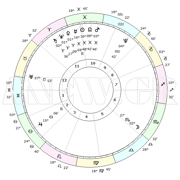 | | ΘΕΣΕΙΣ ΠΛΑΝΗΤΩΝ ΑΣΤΡΟΛΟΓΙΚΟΥ ΧΑΡΤΗ ΤΗΣ ΣΤΙΓΜΗΣ ΑΥΤΗΣ | | | | Πλανήτης | Ζώδιο | Μοίρες | Δεκαήμ. | Σε οίκο | Απόκλιση | | Ακμές των οίκων | | Ηλιος | Ιχθείς | 16°44' | Δεύτερο | 11 | 05 S 14 | | 1ος | 17°59' | Ταύρος | | Σελήνη | Σκορπιός | 01°49' | Πρώτο | 6 | 16 S 02 | | 2ος | 15°28' | Δίδυμοι | | Ερμής | Ιχθείς | 17°02'R | Δεύτερο | 11 | 01 S 46 | | 3ος | 07°31' | Καρκίνος | | Αφροδίτη | Κριός | 01°05' | Πρώτο | 11 | 00 S 42 | | 4ος | 29°35' | Καρκίνος | | Αρης | Ιχθείς | 03°44' | Πρώτο | 11 | 11 S 09 | | 5ος | 26°09' | Λέων | | Δίας | Καρκίνος | 15°07'R | Δεύτερο | 3 | 22 N 56 | | 6ος | 02°27' | Ζυγός | | Κρόνος | Κριός | 02°36' | Πρώτο | 12 | 00 S 55 | | 7ος | 17°59' | Σκορπιός | | Ουρανός | Ταύρος | 27°53' | Τρίτο | 1 | 19 N 31 | | 8ος | 15°28' | Τοξότης | | Ποσειδώνας | Κριός | 01°17' | Πρώτο | 11 | 00 S 41 | | 9ος | 07°31' | Αιγόκερως | | Πλούτωνας | Υδροχόος | 04°42' | Πρώτο | 10 | 22 S 51 | | 10ος | 29°35' | Αιγόκερως | | Β. Δεσμός | Ιχθείς | 08°43' | Πρώτο | 11 | 08 S 18 | | 11ος | 26°09' | Υδροχόος | | Ωροσκόπος | Ταύρος | 17°59' | Δεύτερο | | | 12ος | 02°27' | Κριός | | Μεσουράνημα | Αιγόκερως | 29°35' | Τρίτο | | | |