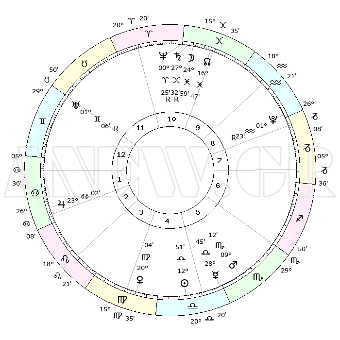 | ΘΕΣΕΙΣ ΠΛΑΝΗΤΩΝ ΑΣΤΡΟΛΟΓΙΚΟΥ ΧΑΡΤΗ ΤΗΣ ΣΤΙΓΜΗΣ ΑΥΤΗΣ | | Πλανήτης | Ζώδιο | Μοίρες | Δεκαήμ. | Σε οίκο | Απόκλιση | | Ακμές των οίκων | Ηλιος | Ζυγός | 12°45' | Δεύτερο | 5 | 05 S 02 | | 1ος | 28°10' | Ταύρος | Σελήνη | Ιχθείς | 23°30' | Τρίτο | 11 | 02 S 08 | | 2ος | 23°21' | Δίδυμοι | Ερμής | Ζυγός | 28°35' | Τρίτο | 6 | 11 S 36 | | 3ος | 14°50' | Καρκίνος | Αφροδίτη | Παρθένος | 19°57' | Δεύτερο | 5 | 05 N 16 | | 4ος | 07°28' | Λέων | Αρης | Σκορπιός | 09°07' | Πρώτο | 6 | 14 S 39 | | 5ος | 05°37' | Παρθένος | Δίας | Καρκίνος | 23°01' | Τρίτο | 3 | 21 N 30 | | 6ος | 13°47' | Ζυγός | Κρόνος | Ιχθείς | 27°32'R | Τρίτο | 11 | 03 S 17 | | 7ος | 28°10' | Σκορπιός | Ουρανός | Δίδυμοι | 01°06'R | Πρώτο | 1 | 20 N 10 | | 8ος | 23°21' | Τοξότης | Ποσειδώνας | Κριός | 00°25'R | Πρώτο | 11 | 01 S 06 | | 9ος | 14°50' | Αιγόκερως | Πλούτωνας | Υδροχόος | 01°23'R | Πρώτο | 9 | 23 S 32 | | 10ος | 07°28' | Υδροχόος | Β. Δεσμός | Ιχθείς | 16°47' | Δεύτερο | 11 | 05 S 13 | | 11ος | 05°37' | Ιχθείς | Ωροσκόπος | Ταύρος | 28°10' | Τρίτο | | | 12ος | 13°47' | Κριός | Μεσουράνημα | Υδροχόος | 07°28' | Πρώτο | | | |