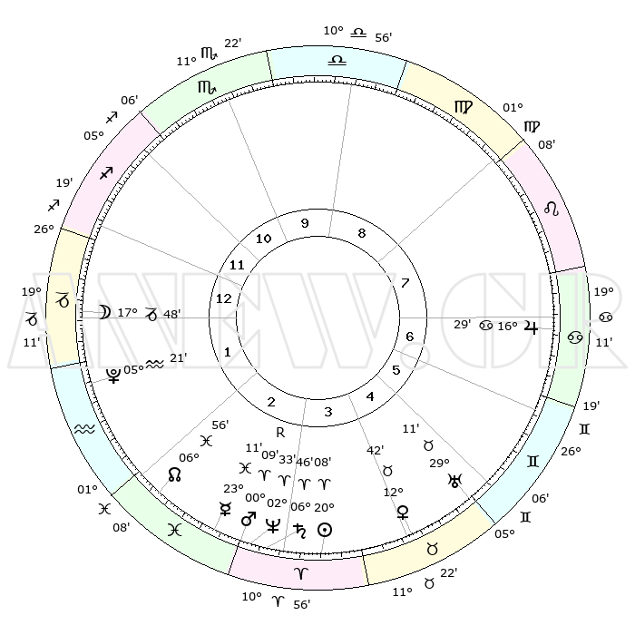 | | ΘΕΣΕΙΣ ΠΛΑΝΗΤΩΝ ΑΣΤΡΟΛΟΓΙΚΟΥ ΧΑΡΤΗ ΤΗΣ ΣΤΙΓΜΗΣ ΑΥΤΗΣ | | | | Πλανήτης | Ζώδιο | Μοίρες | Δεκαήμ. | Σε οίκο | Απόκλιση | | Ακμές των οίκων | | Ηλιος | Κριός | 20°04' | Τρίτο | 4 | 07 N 51 | | 1ος | 25°23' | Τοξότης | | Σελήνη | Αιγόκερως | 16°58' | Δεύτερο | 1 | 26 S 21 | | 2ος | 01°23' | Υδροχόος | | Ερμής | Ιχθείς | 23°06' | Τρίτο | 3 | 04 S 53 | | 3ος | 10°59' | Ιχθείς | | Αφροδίτη | Ταύρος | 12°37' | Δεύτερο | 4 | 15 N 34 | | 4ος | 15°36' | Κριός | | Αρης | Κριός | 00°06'R | Πρώτο | 3 | 00 S 53 | | 5ος | 12°40' | Ταύρος | | Δίας | Καρκίνος | 16°28' | Δεύτερο | 7 | 22 N 47 | | 6ος | 04°49' | Δίδυμοι | | Κρόνος | Κριός | 06°46' | Πρώτο | 3 | 00 N 43 | | 7ος | 25°23' | Δίδυμοι | | Ουρανός | Ταύρος | 29°10' | Τρίτο | 5 | 19 N 48 | | 8ος | 01°23' | Λέων | | Ποσειδώνας | Κριός | 02°32' | Πρώτο | 3 | 00 S 12 | | 9ος | 10°59' | Παρθένος | | Πλούτωνας | Υδροχόος | 05°21' | Πρώτο | 2 | 22 S 47 | | 10ος | 15°36' | Ζυγός | | Β. Δεσμός | Ιχθείς | 06°56' | Πρώτο | 2 | 08 S 58 | | 11ος | 12°41' | Σκορπιός | | Ωροσκόπος | Τοξότης | 25°23' | Τρίτο | | | 12ος | 04°49' | Τοξότης | | Μεσουράνημα | Ζυγός | 15°36' | Δεύτερο | | | |