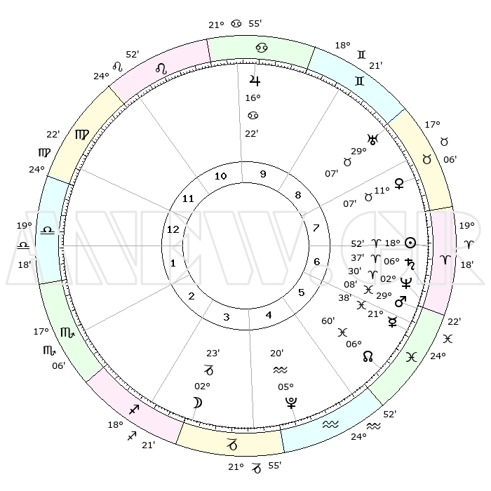 | | ΘΕΣΕΙΣ ΠΛΑΝΗΤΩΝ ΑΣΤΡΟΛΟΓΙΚΟΥ ΧΑΡΤΗ ΤΗΣ ΣΤΙΓΜΗΣ ΑΥΤΗΣ | | | | Πλανήτης | Ζώδιο | Μοίρες | Δεκαήμ. | Σε οίκο | Απόκλιση | | Ακμές των οίκων | | Ηλιος | Κριός | 18°48' | Δεύτερο | 7 | 07 N 22 | | 1ος | 00°05' | Ζυγός | | Σελήνη | Αιγόκερως | 01°37' | Πρώτο | 4 | 28 S 10 | | 2ος | 26°41' | Ζυγός | | Ερμής | Ιχθείς | 21°33' | Τρίτο | 6 | 05 S 24 | | 3ος | 27°07' | Σκορπιός | | Αφροδίτη | Ταύρος | 11°02' | Δεύτερο | 8 | 15 N 02 | | 4ος | 00°06' | Αιγόκερως | | Αρης | Ιχθείς | 29°05' | Τρίτο | 6 | 01 S 18 | | 5ος | 03°05' | Υδροχόος | | Δίας | Καρκίνος | 16°22' | Δεύτερο | 10 | 22 N 48 | | 6ος | 03°30' | Ιχθείς | | Κρόνος | Κριός | 06°36' | Πρώτο | 7 | 00 N 40 | | 7ος | 00°05' | Κριός | | Ουρανός | Ταύρος | 29°07' | Τρίτο | 9 | 19 N 47 | | 8ος | 26°41' | Κριός | | Ποσειδώνας | Κριός | 02°30' | Πρώτο | 7 | 00 S 13 | | 9ος | 27°07' | Ταύρος | | Πλούτωνας | Υδροχόος | 05°20' | Πρώτο | 5 | 22 S 47 | | 10ος | 00°06' | Καρκίνος | | Β. Δεσμός | Ιχθείς | 06°60' | Πρώτο | 6 | 08 S 56 | | 11ος | 03°05' | Λέων | | Ωροσκόπος | Ζυγός | 00°05' | Πρώτο | | | 12ος | 03°30' | Παρθένος | | Μεσουράνημα | Καρκίνος | 00°06' | Πρώτο | | | |
