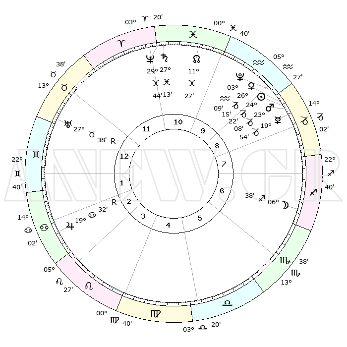| | ΘΕΣΕΙΣ ΠΛΑΝΗΤΩΝ ΑΣΤΡΟΛΟΓΙΚΟΥ ΧΑΡΤΗ ΤΗΣ ΣΤΙΓΜΗΣ ΑΥΤΗΣ | | | | Πλανήτης | Ζώδιο | Μοίρες | Δεκαήμ. | Σε οίκο | Απόκλιση | | Ακμές των οίκων | | Ηλιος | Αιγόκερως | 23°35' | Τρίτο | 5 | 21 S 22 | | 1ος | 29°53' | Λέων | | Σελήνη | Σκορπιός | 27°27' | Τρίτο | 4 | 24 S 27 | | 2ος | 23°43' | Παρθένος | | Ερμής | Αιγόκερως | 18°39' | Δεύτερο | 5 | 23 S 50 | | 3ος | 22°23' | Ζυγός | | Αφροδίτη | Αιγόκερως | 25°17' | Τρίτο | 5 | 22 S 00 | | 4ος | 25°18' | Σκορπιός | | Αρης | Αιγόκερως | 22°32' | Τρίτο | 5 | 22 S 30 | | 5ος | 29°30' | Τοξότης | | Δίας | Καρκίνος | 19°39'R | Δεύτερο | 11 | 22 N 16 | | 6ος | 01°28' | Υδροχόος | | Κρόνος | Ιχθείς | 27°09' | Τρίτο | 8 | 03 S 10 | | 7ος | 29°53' | Υδροχόος | | Ουρανός | Ταύρος | 27°39'R | Τρίτο | 10 | 19 N 27 | | 8ος | 23°43' | Ιχθείς | | Ποσειδώνας | Ιχθείς | 29°43' | Τρίτο | 8 | 01 S 20 | | 9ος | 22°23' | Κριός | | Πλούτωνας | Υδροχόος | 03°07' | Πρώτο | 6 | 23 S 08 | | 10ος | 25°18' | Ταύρος | | Β. Δεσμός | Ιχθείς | 11°30' | Δεύτερο | 7 | 07 S 15 | | 11ος | 29°30' | Δίδυμοι | | Ωροσκόπος | Λέων | 29°53' | Τρίτο | | | 12ος | 01°28' | Λέων | | Μεσουράνημα | Ταύρος | 25°18' | Τρίτο | | | |