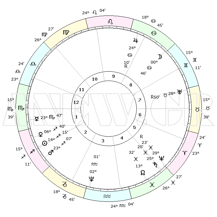 | | ΘΕΣΕΙΣ ΠΛΑΝΗΤΩΝ ΑΣΤΡΟΛΟΓΙΚΟΥ ΧΑΡΤΗ ΤΗΣ ΣΤΙΓΜΗΣ ΑΥΤΗΣ | | | | Πλανήτης | Ζώδιο | Μοίρες | Δεκαήμ. | Σε οίκο | Απόκλιση | | Ακμές των οίκων | | Ηλιος | Τοξότης | 14°11' | Δεύτερο | 2 | 22 S 30 | | 1ος | 27°55' | Ζυγός | | Σελήνη | Δίδυμοι | 29°51' | Τρίτο | 9 | 28 N 14 | | 2ος | 26°12' | Σκορπιός | | Ερμής | Σκορπιός | 23°44' | Τρίτο | 1 | 16 S 18 | | 3ος | 28°00' | Τοξότης | | Αφροδίτη | Τοξότης | 06°35' | Πρώτο | 2 | 20 S 54 | | 4ος | 02°03' | Υδροχόος | | Αρης | Τοξότης | 23°05' | Τρίτο | 2 | 23 S 57 | | 5ος | 04°60' | Ιχθείς | | Δίας | Καρκίνος | 24°10'R | Τρίτο | 9 | 21 N 27 | | 6ος | 03°51' | Κριός | | Κρόνος | Ιχθείς | 25°20' | Τρίτο | 5 | 04 S 01 | | 7ος | 27°55' | Κριός | | Ουρανός | Ταύρος | 28°50'R | Τρίτο | 8 | 19 N 42 | | 8ος | 26°12' | Ταύρος | | Ποσειδώνας | Ιχθείς | 29°23'R | Τρίτο | 5 | 01 S 29 | | 9ος | 28°00' | Δίδυμοι | | Πλούτωνας | Υδροχόος | 02°01' | Πρώτο | 3 | 23 S 22 | | 10ος | 02°03' | Λέων | | Β. Δεσμός | Ιχθείς | 13°33' | Δεύτερο | 5 | 06 S 28 | | 11ος | 04°60' | Παρθένος | | Ωροσκόπος | Ζυγός | 27°55' | Τρίτο | | | 12ος | 03°51' | Ζυγός | | Μεσουράνημα | Λέων | 02°03' | Πρώτο | | | |