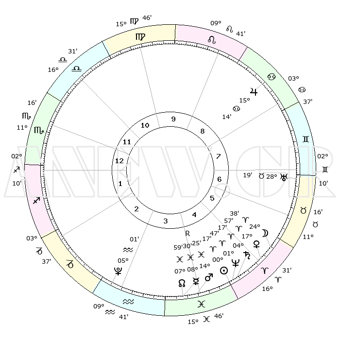 | | ΘΕΣΕΙΣ ΠΛΑΝΗΤΩΝ ΑΣΤΡΟΛΟΓΙΚΟΥ ΧΑΡΤΗ ΤΗΣ ΣΤΙΓΜΗΣ ΑΥΤΗΣ | | | | Πλανήτης | Ζώδιο | Μοίρες | Δεκαήμ. | Σε οίκο | Απόκλιση | | Ακμές των οίκων | | Ηλιος | Κριός | 00°13' | Πρώτο | 5 | 00 N 05 | | 1ος | 10°47' | Σκορπιός | | Σελήνη | Κριός | 23°35' | Τρίτο | 6 | 12 N 35 | | 2ος | 09°56' | Τοξότης | | Ερμής | Ιχθείς | 08°30'R | Πρώτο | 4 | 07 S 28 | | 3ος | 12°54' | Αιγόκερως | | Αφροδίτη | Κριός | 17°52' | Δεύτερο | 5 | 06 N 12 | | 4ος | 17°53' | Υδροχόος | | Αρης | Ιχθείς | 14°22' | Δεύτερο | 4 | 07 S 09 | | 5ος | 20°31' | Ιχθείς | | Δίας | Καρκίνος | 15°14' | Δεύτερο | 9 | 22 N 55 | | 6ος | 18°04' | Κριός | | Κρόνος | Κριός | 04°16' | Πρώτο | 5 | 00 S 15 | | 7ος | 10°47' | Ταύρος | | Ουρανός | Ταύρος | 28°19' | Τρίτο | 7 | 19 N 37 | | 8ος | 09°56' | Δίδυμοι | | Ποσειδώνας | Κριός | 01°47' | Πρώτο | 5 | 00 S 29 | | 9ος | 12°54' | Καρκίνος | | Πλούτωνας | Υδροχόος | 05°01' | Πρώτο | 3 | 22 S 49 | | 10ος | 17°53' | Λέων | | Β. Δεσμός | Ιχθείς | 07°60' | Πρώτο | 4 | 08 S 34 | | 11ος | 20°31' | Παρθένος | | Ωροσκόπος | Σκορπιός | 10°47' | Δεύτερο | | | 12ος | 18°04' | Ζυγός | | Μεσουράνημα | Λέων | 17°53' | Δεύτερο | | | |