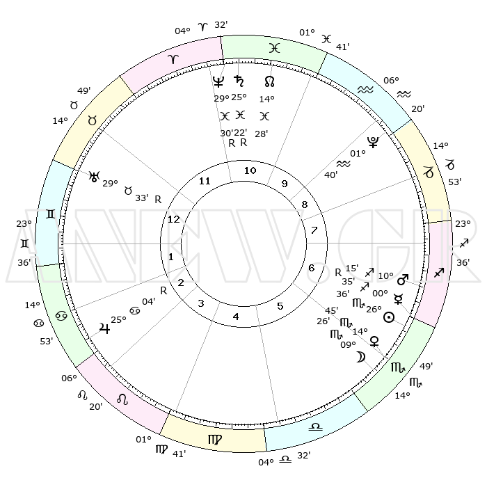 | | ΘΕΣΕΙΣ ΠΛΑΝΗΤΩΝ ΑΣΤΡΟΛΟΓΙΚΟΥ ΧΑΡΤΗ ΤΗΣ ΣΤΙΓΜΗΣ ΑΥΤΗΣ | | | | Πλανήτης | Ζώδιο | Μοίρες | Δεκαήμ. | Σε οίκο | Απόκλιση | | Ακμές των οίκων | | Ηλιος | Σκορπιός | 26°32' | Τρίτο | 6 | 19 S 23 | | 1ος | 29°57' | Ταύρος | | Σελήνη | Σκορπιός | 08°42' | Πρώτο | 6 | 18 S 11 | | 2ος | 24°46' | Δίδυμοι | | Ερμής | Τοξότης | 00°40'R | Πρώτο | 7 | 20 S 20 | | 3ος | 16°12' | Καρκίνος | | Αφροδίτη | Σκορπιός | 14°41' | Δεύτερο | 6 | 15 S 11 | | 4ος | 08°57' | Λέων | | Αρης | Τοξότης | 10°12' | Δεύτερο | 7 | 22 S 31 | | 5ος | 07°24' | Παρθένος | | Δίας | Καρκίνος | 25°04'R | Τρίτο | 3 | 21 N 14 | | 6ος | 15°51' | Ζυγός | | Κρόνος | Ιχθείς | 25°22'R | Τρίτο | 11 | 04 S 03 | | 7ος | 29°57' | Σκορπιός | | Ουρανός | Ταύρος | 29°34'R | Τρίτο | 12 | 19 N 51 | | 8ος | 24°46' | Τοξότης | | Ποσειδώνας | Ιχθείς | 29°30'R | Τρίτο | 11 | 01 S 27 | | 9ος | 16°12' | Αιγόκερως | | Πλούτωνας | Υδροχόος | 01°40' | Πρώτο | 9 | 23 S 27 | | 10ος | 08°57' | Υδροχόος | | Β. Δεσμός | Ιχθείς | 14°28' | Δεύτερο | 11 | 06 S 07 | | 11ος | 07°24' | Ιχθείς | | Ωροσκόπος | Ταύρος | 29°57' | Τρίτο | | | 12ος | 15°51' | Κριός | | Μεσουράνημα | Υδροχόος | 08°57' | Πρώτο | | | |