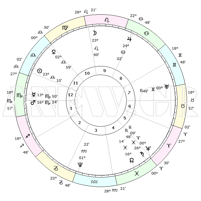 | ΘΕΣΕΙΣ ΠΛΑΝΗΤΩΝ ΑΣΤΡΟΛΟΓΙΚΟΥ ΧΑΡΤΗ ΤΗΣ ΣΤΙΓΜΗΣ ΑΥΤΗΣ | | Πλανήτης | Ζώδιο | Μοίρες | Δεκαήμ. | Σε οίκο | Απόκλιση | | Ακμές των οίκων | Ηλιος | Ζυγός | 23°01' | Τρίτο | 1 | 08 S 57 | | 1ος | 04°59' | Ζυγός | Σελήνη | Λέων | 22°04' | Τρίτο | 11 | 16 N 18 | | 2ος | 01°56' | Σκορπιός | Ερμής | Σκορπιός | 13°38' | Δεύτερο | 2 | 17 S 42 | | 3ος | 02°33' | Τοξότης | Αφροδίτη | Ζυγός | 02°48' | Πρώτο | 12 | 00 N 17 | | 4ος | 05°36' | Αιγόκερως | Αρης | Σκορπιός | 16°18' | Δεύτερο | 2 | 16 S 56 | | 5ος | 08°33' | Υδροχόος | Δίας | Καρκίνος | 24°01' | Τρίτο | 10 | 21 N 21 | | 6ος | 08°47' | Ιχθείς | Κρόνος | Ιχθείς | 26°49'R | Τρίτο | 6 | 03 S 34 | | 7ος | 04°59' | Κριός | Ουρανός | Δίδυμοι | 00°49'R | Πρώτο | 8 | 20 N 07 | | 8ος | 01°56' | Ταύρος | Ποσειδώνας | Κριός | 00°09'R | Πρώτο | 6 | 01 S 12 | | 9ος | 02°33' | Δίδυμοι | Πλούτωνας | Υδροχόος | 01°22' | Πρώτο | 4 | 23 S 32 | | 10ος | 05°36' | Καρκίνος | Β. Δεσμός | Ιχθείς | 16°14' | Δεύτερο | 6 | 05 S 26 | | 11ος | 08°33' | Λέων | Ωροσκόπος | Ζυγός | 04°59' | Πρώτο | | | 12ος | 08°47' | Παρθένος | Μεσουράνημα | Καρκίνος | 05°36' | Πρώτο | | | |