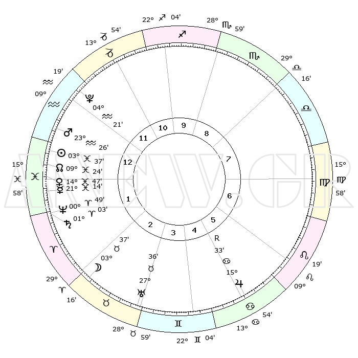 | | ΘΕΣΕΙΣ ΠΛΑΝΗΤΩΝ ΑΣΤΡΟΛΟΓΙΚΟΥ ΧΑΡΤΗ ΤΗΣ ΣΤΙΓΜΗΣ ΑΥΤΗΣ | | | | Πλανήτης | Ζώδιο | Μοίρες | Δεκαήμ. | Σε οίκο | Απόκλιση | | Ακμές των οίκων | | Ηλιος | Ιχθείς | 03°32' | Πρώτο | 1 | 10 S 12 | | 1ος | 07°53' | Υδροχόος | | Σελήνη | Ταύρος | 02°35' | Πρώτο | 3 | 16 N 22 | | 2ος | 23°03' | Ιχθείς | | Ερμής | Ιχθείς | 21°12' | Τρίτο | 1 | 01 S 50 | | 3ος | 00°08' | Ταύρος | | Αφροδίτη | Ιχθείς | 14°42' | Δεύτερο | 1 | 07 S 21 | | 4ος | 27°19' | Ταύρος | | Αρης | Υδροχόος | 23°22' | Τρίτο | 1 | 14 S 45 | | 5ος | 19°35' | Δίδυμοι | | Δίας | Καρκίνος | 15°33'R | Δεύτερο | 6 | 22 N 52 | | 6ος | 11°22' | Καρκίνος | | Κρόνος | Κριός | 01°02' | Πρώτο | 2 | 01 S 33 | | 7ος | 07°53' | Λέων | | Ουρανός | Ταύρος | 27°36' | Τρίτο | 4 | 19 N 27 | | 8ος | 23°03' | Παρθένος | | Ποσειδώνας | Κριός | 00°48' | Πρώτο | 2 | 00 S 53 | | 9ος | 00°08' | Σκορπιός | | Πλούτωνας | Υδροχόος | 04°21' | Πρώτο | 12 | 22 S 54 | | 10ος | 27°19' | Σκορπιός | | Β. Δεσμός | Ιχθείς | 09°24' | Πρώτο | 1 | 08 S 02 | | 11ος | 19°35' | Τοξότης | | Ωροσκόπος | Υδροχόος | 07°53' | Πρώτο | | | 12ος | 11°22' | Αιγόκερως | | Μεσουράνημα | Σκορπιός | 27°19' | Τρίτο | | | |