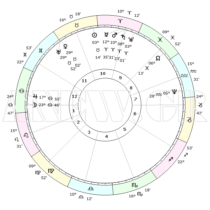 | | ΘΕΣΕΙΣ ΠΛΑΝΗΤΩΝ ΑΣΤΡΟΛΟΓΙΚΟΥ ΧΑΡΤΗ ΤΗΣ ΣΤΙΓΜΗΣ ΑΥΤΗΣ | | | | Πλανήτης | Ζώδιο | Μοίρες | Δεκαήμ. | Σε οίκο | Απόκλιση | | Ακμές των οίκων | | Ηλιος | Ταύρος | 03°11' | Πρώτο | 11 | 12 N 34 | | 1ος | 07°40' | Καρκίνος | | Σελήνη | Καρκίνος | 22°59' | Τρίτο | 1 | 25 N 00 | | 2ος | 28°09' | Καρκίνος | | Ερμής | Κριός | 12°30' | Δεύτερο | 10 | 02 N 37 | | 3ος | 20°33' | Λέων | | Αφροδίτη | Ταύρος | 28°58' | Τρίτο | 11 | 20 N 28 | | 4ος | 18°07' | Παρθένος | | Αρης | Κριός | 10°29' | Δεύτερο | 10 | 03 N 17 | | 5ος | 23°08' | Ζυγός | | Δίας | Καρκίνος | 17°54' | Δεύτερο | 1 | 22 N 37 | | 6ος | 02°23' | Τοξότης | | Κρόνος | Κριός | 08°23' | Πρώτο | 10 | 01 N 20 | | 7ος | 07°40' | Αιγόκερως | | Ουρανός | Ταύρος | 29°51' | Τρίτο | 11 | 19 N 57 | | 8ος | 28°09' | Αιγόκερως | | Ποσειδώνας | Κριός | 03°01' | Πρώτο | 10 | 00 S 01 | | 9ος | 20°33' | Υδροχόος | | Πλούτωνας | Υδροχόος | 05°28' | Πρώτο | 8 | 22 S 48 | | 10ος | 18°07' | Ιχθείς | | Β. Δεσμός | Ιχθείς | 06°13' | Πρώτο | 9 | 09 S 14 | | 11ος | 23°08' | Κριός | | Ωροσκόπος | Καρκίνος | 07°40' | Πρώτο | | | 12ος | 02°23' | Δίδυμοι | | Μεσουράνημα | Ιχθείς | 18°07' | Δεύτερο | | | |