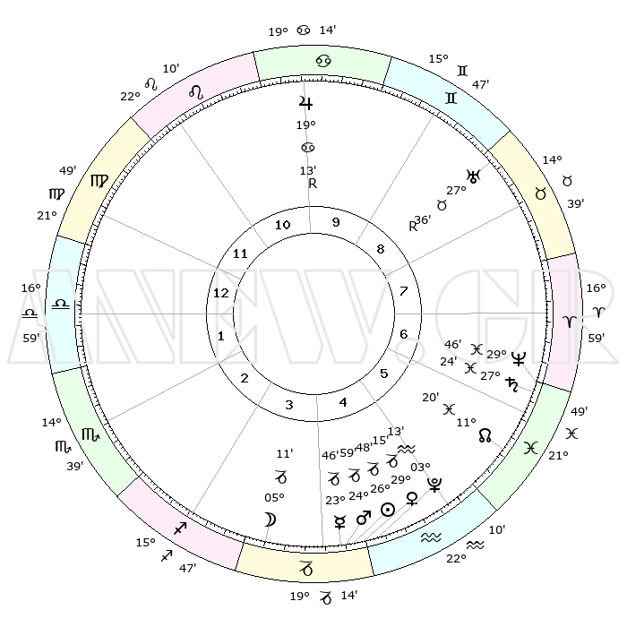 | | ΘΕΣΕΙΣ ΠΛΑΝΗΤΩΝ ΑΣΤΡΟΛΟΓΙΚΟΥ ΧΑΡΤΗ ΤΗΣ ΣΤΙΓΜΗΣ ΑΥΤΗΣ | | | | Πλανήτης | Ζώδιο | Μοίρες | Δεκαήμ. | Σε οίκο | Απόκλιση | | Ακμές των οίκων | | Ηλιος | Αιγόκερως | 25°12' | Τρίτο | 11 | 21 S 05 | | 1ος | 26°22' | Ιχθείς | | Σελήνη | Τοξότης | 16°23' | Δεύτερο | 9 | 27 S 48 | | 2ος | 07°31' | Ταύρος | | Ερμής | Αιγόκερως | 21°14' | Τρίτο | 11 | 23 S 32 | | 3ος | 05°29' | Δίδυμοι | | Αφροδίτη | Αιγόκερως | 27°17' | Τρίτο | 11 | 21 S 40 | | 4ος | 27°57' | Δίδυμοι | | Αρης | Αιγόκερως | 23°46' | Τρίτο | 11 | 22 S 18 | | 5ος | 20°07' | Καρκίνος | | Δίας | Καρκίνος | 19°26'R | Δεύτερο | 4 | 22 N 18 | | 6ος | 16°58' | Λέων | | Κρόνος | Ιχθείς | 27°16' | Τρίτο | 1 | 03 S 07 | | 7ος | 26°22' | Παρθένος | | Ουρανός | Ταύρος | 27°37'R | Τρίτο | 2 | 19 N 26 | | 8ος | 07°31' | Σκορπιός | | Ποσειδώνας | Ιχθείς | 29°45' | Τρίτο | 1 | 01 S 19 | | 9ος | 05°29' | Τοξότης | | Πλούτωνας | Υδροχόος | 03°10' | Πρώτο | 11 | 23 S 08 | | 10ος | 27°57' | Τοξότης | | Β. Δεσμός | Ιχθείς | 11°25' | Δεύτερο | 12 | 07 S 17 | | 11ος | 20°07' | Αιγόκερως | | Ωροσκόπος | Ιχθείς | 26°22' | Τρίτο | | | 12ος | 16°58' | Υδροχόος | | Μεσουράνημα | Τοξότης | 27°57' | Τρίτο | | | |