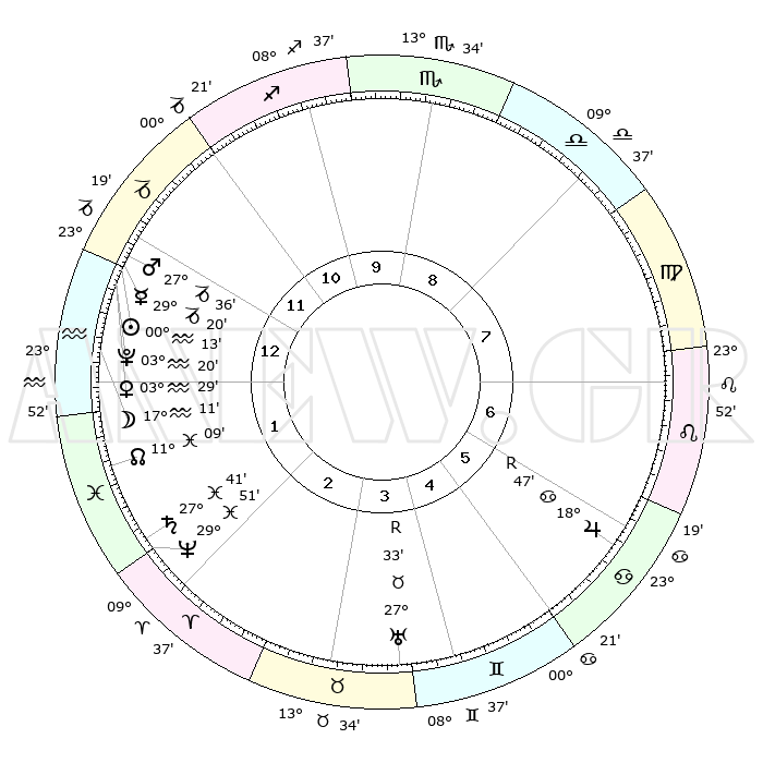 | | ΘΕΣΕΙΣ ΠΛΑΝΗΤΩΝ ΑΣΤΡΟΛΟΓΙΚΟΥ ΧΑΡΤΗ ΤΗΣ ΣΤΙΓΜΗΣ ΑΥΤΗΣ | | | | Πλανήτης | Ζώδιο | Μοίρες | Δεκαήμ. | Σε οίκο | Απόκλιση | | Ακμές των οίκων | | Ηλιος | Υδροχόος | 00°07' | Πρώτο | 1 | 20 S 07 | | 1ος | 10°17' | Αιγόκερως | | Σελήνη | Υδροχόος | 15°53' | Δεύτερο | 1 | 18 S 03 | | 2ος | 20°03' | Υδροχόος | | Ερμής | Αιγόκερως | 29°10' | Τρίτο | 1 | 22 S 18 | | 3ος | 00°21' | Κριός | | Αφροδίτη | Υδροχόος | 03°21' | Πρώτο | 1 | 20 S 30 | | 4ος | 02°29' | Ταύρος | | Αρης | Αιγόκερως | 27°31' | Τρίτο | 1 | 21 S 38 | | 5ος | 27°17' | Ταύρος | | Δίας | Καρκίνος | 18°48'R | Δεύτερο | 7 | 22 N 24 | | 6ος | 18°36' | Δίδυμοι | | Κρόνος | Ιχθείς | 27°40' | Τρίτο | 2 | 02 S 57 | | 7ος | 10°17' | Καρκίνος | | Ουρανός | Ταύρος | 27°33'R | Τρίτο | 5 | 19 N 25 | | 8ος | 20°03' | Λέων | | Ποσειδώνας | Ιχθείς | 29°51' | Τρίτο | 2 | 01 S 16 | | 9ος | 00°21' | Ζυγός | | Πλούτωνας | Υδροχόος | 03°19' | Πρώτο | 1 | 23 S 06 | | 10ος | 02°28' | Σκορπιός | | Β. Δεσμός | Ιχθείς | 11°09' | Δεύτερο | 2 | 07 S 23 | | 11ος | 27°17' | Σκορπιός | | Ωροσκόπος | Αιγόκερως | 10°17' | Δεύτερο | | | 12ος | 18°36' | Τοξότης | | Μεσουράνημα | Σκορπιός | 02°28' | Πρώτο | | | |