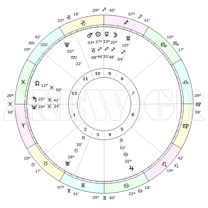 | | ΘΕΣΕΙΣ ΠΛΑΝΗΤΩΝ ΑΣΤΡΟΛΟΓΙΚΟΥ ΧΑΡΤΗ ΤΗΣ ΣΤΙΓΜΗΣ ΑΥΤΗΣ | | | | Πλανήτης | Ζώδιο | Μοίρες | Δεκαήμ. | Σε οίκο | Απόκλιση | | Ακμές των οίκων | | Ηλιος | Τοξότης | 27°43' | Τρίτο | 10 | 23 S 25 | | 1ος | 23°56' | Υδροχόος | | Σελήνη | Τοξότης | 20°02' | Τρίτο | 10 | 28 S 00 | | 2ος | 09°41' | Κριός | | Ερμής | Τοξότης | 09°58' | Πρώτο | 10 | 20 S 58 | | 3ος | 13°37' | Ταύρος | | Αφροδίτη | Τοξότης | 23°20' | Τρίτο | 10 | 23 S 17 | | 4ος | 08°39' | Δίδυμοι | | Αρης | Αιγόκερως | 03°05' | Πρώτο | 11 | 24 S 12 | | 5ος | 00°24' | Καρκίνος | | Δίας | Καρκίνος | 22°54'R | Τρίτο | 5 | 21 N 42 | | 6ος | 23°22' | Καρκίνος | | Κρόνος | Ιχθείς | 25°41' | Τρίτο | 1 | 03 S 50 | | 7ος | 23°56' | Λέων | | Ουρανός | Ταύρος | 28°20'R | Τρίτο | 3 | 19 N 35 | | 8ος | 09°41' | Ζυγός | | Ποσειδώνας | Ιχθείς | 29°24' | Τρίτο | 1 | 01 S 28 | | 9ος | 13°37' | Σκορπιός | | Πλούτωνας | Υδροχόος | 02°22' | Πρώτο | 12 | 23 S 18 | | 10ος | 08°39' | Τοξότης | | Β. Δεσμός | Ιχθείς | 12°50' | Δεύτερο | 1 | 06 S 44 | | 11ος | 00°24' | Αιγόκερως | | Ωροσκόπος | Υδροχόος | 23°56' | Τρίτο | | | 12ος | 23°22' | Αιγόκερως | | Μεσουράνημα | Τοξότης | 08°39' | Πρώτο | | | |