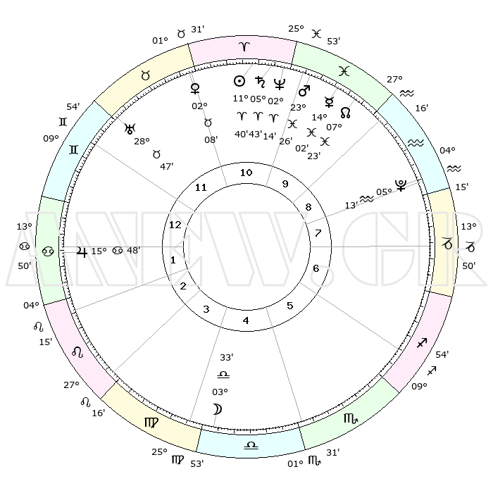 | | ΘΕΣΕΙΣ ΠΛΑΝΗΤΩΝ ΑΣΤΡΟΛΟΓΙΚΟΥ ΧΑΡΤΗ ΤΗΣ ΣΤΙΓΜΗΣ ΑΥΤΗΣ | | | | Πλανήτης | Ζώδιο | Μοίρες | Δεκαήμ. | Σε οίκο | Απόκλιση | | Ακμές των οίκων | | Ηλιος | Κριός | 11°37' | Δεύτερο | 11 | 04 N 36 | | 1ος | 25°29' | Δίδυμοι | | Σελήνη | Ζυγός | 02°49' | Πρώτο | 4 | 03 S 04 | | 2ος | 16°36' | Καρκίνος | | Ερμής | Ιχθείς | 13°60' | Δεύτερο | 10 | 07 S 33 | | 3ος | 08°08' | Λέων | | Αφροδίτη | Ταύρος | 02°04' | Πρώτο | 11 | 11 N 47 | | 4ος | 03°46' | Παρθένος | | Αρης | Ιχθείς | 23°24' | Τρίτο | 10 | 03 S 35 | | 5ος | 06°56' | Ζυγός | | Δίας | Καρκίνος | 15°48' | Δεύτερο | 1 | 22 N 52 | | 6ος | 17°11' | Σκορπιός | | Κρόνος | Κριός | 05°42' | Πρώτο | 10 | 00 N 19 | | 7ος | 25°29' | Τοξότης | | Ουρανός | Ταύρος | 28°47' | Τρίτο | 12 | 19 N 43 | | 8ος | 16°36' | Αιγόκερως | | Ποσειδώνας | Κριός | 02°13' | Πρώτο | 10 | 00 S 19 | | 9ος | 08°08' | Υδροχόος | | Πλούτωνας | Υδροχόος | 05°13' | Πρώτο | 8 | 22 S 47 | | 10ος | 03°46' | Ιχθείς | | Β. Δεσμός | Ιχθείς | 07°23' | Πρώτο | 10 | 08 S 48 | | 11ος | 06°56' | Κριός | | Ωροσκόπος | Δίδυμοι | 25°29' | Τρίτο | | | 12ος | 17°11' | Ταύρος | | Μεσουράνημα | Ιχθείς | 03°46' | Πρώτο | | | |