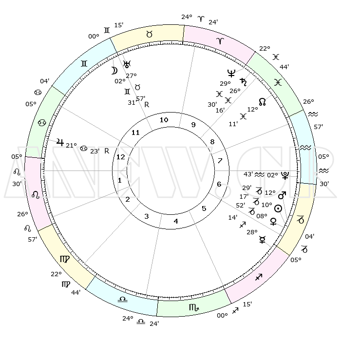 | | ΘΕΣΕΙΣ ΠΛΑΝΗΤΩΝ ΑΣΤΡΟΛΟΓΙΚΟΥ ΧΑΡΤΗ ΤΗΣ ΣΤΙΓΜΗΣ ΑΥΤΗΣ | | | | Πλανήτης | Ζώδιο | Μοίρες | Δεκαήμ. | Σε οίκο | Απόκλιση | | Ακμές των οίκων | | Ηλιος | Αιγόκερως | 10°12' | Δεύτερο | 6 | 23 S 02 | | 1ος | 11°18' | Καρκίνος | | Σελήνη | Δίδυμοι | 01°18' | Πρώτο | 11 | 25 N 18 | | 2ος | 01°43' | Λέων | | Ερμής | Τοξότης | 28°07' | Τρίτο | 6 | 23 S 57 | | 3ος | 24°29' | Λέων | | Αφροδίτη | Αιγόκερως | 08°46' | Πρώτο | 6 | 23 S 38 | | 4ος | 22°40' | Παρθένος | | Αρης | Αιγόκερως | 12°25' | Δεύτερο | 7 | 23 S 44 | | 5ος | 28°04' | Ζυγός | | Δίας | Καρκίνος | 21°24'R | Τρίτο | 1 | 21 N 58 | | 6ος | 06°50' | Τοξότης | | Κρόνος | Ιχθείς | 26°16' | Τρίτο | 10 | 03 S 34 | | 7ος | 11°18' | Αιγόκερως | | Ουρανός | Ταύρος | 27°57'R | Τρίτο | 11 | 19 N 30 | | 8ος | 01°43' | Υδροχόος | | Ποσειδώνας | Ιχθείς | 29°30' | Τρίτο | 10 | 01 S 25 | | 9ος | 24°29' | Υδροχόος | | Πλούτωνας | Υδροχόος | 02°43' | Πρώτο | 8 | 23 S 13 | | 10ος | 22°40' | Ιχθείς | | Β. Δεσμός | Ιχθείς | 12°11' | Δεύτερο | 9 | 06 S 59 | | 11ος | 28°04' | Κριός | | Ωροσκόπος | Καρκίνος | 11°18' | Δεύτερο | | | 12ος | 06°50' | Δίδυμοι | | Μεσουράνημα | Ιχθείς | 22°40' | Τρίτο | | | |