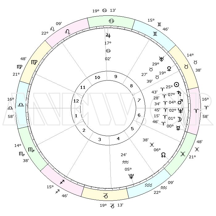 | | ΘΕΣΕΙΣ ΠΛΑΝΗΤΩΝ ΑΣΤΡΟΛΟΓΙΚΟΥ ΧΑΡΤΗ ΤΗΣ ΣΤΙΓΜΗΣ ΑΥΤΗΣ | | | | Πλανήτης | Ζώδιο | Μοίρες | Δεκαήμ. | Σε οίκο | Απόκλιση | | Ακμές των οίκων | | Ηλιος | Κριός | 25°39' | Τρίτο | 8 | 09 N 55 | | 1ος | 27°32' | Παρθένος | | Σελήνη | Κριός | 00°20' | Πρώτο | 7 | 01 N 55 | | 2ος | 23°56' | Ζυγός | | Ερμής | Κριός | 00°40' | Πρώτο | 7 | 02 S 07 | | 3ος | 24°17' | Σκορπιός | | Αφροδίτη | Ταύρος | 19°34' | Δεύτερο | 8 | 17 N 49 | | 4ος | 27°14' | Τοξότης | | Αρης | Κριός | 04°31' | Πρώτο | 7 | 00 N 54 | | 5ος | 00°14' | Υδροχόος | | Δίας | Καρκίνος | 17°02' | Δεύτερο | 10 | 22 N 44 | | 6ος | 00°46' | Ιχθείς | | Κρόνος | Κριός | 07°27' | Πρώτο | 7 | 00 N 59 | | 7ος | 27°32' | Ιχθείς | | Ουρανός | Ταύρος | 29°27' | Τρίτο | 9 | 19 N 52 | | 8ος | 23°56' | Κριός | | Ποσειδώνας | Κριός | 02°45' | Πρώτο | 7 | 00 S 07 | | 9ος | 24°16' | Ταύρος | | Πλούτωνας | Υδροχόος | 05°24' | Πρώτο | 5 | 22 S 47 | | 10ος | 27°14' | Δίδυμοι | | Β. Δεσμός | Ιχθείς | 06°38' | Πρώτο | 6 | 09 S 05 | | 11ος | 00°14' | Λέων | | Ωροσκόπος | Παρθένος | 27°32' | Τρίτο | | | 12ος | 00°46' | Παρθένος | | Μεσουράνημα | Δίδυμοι | 27°14' | Τρίτο | | | |