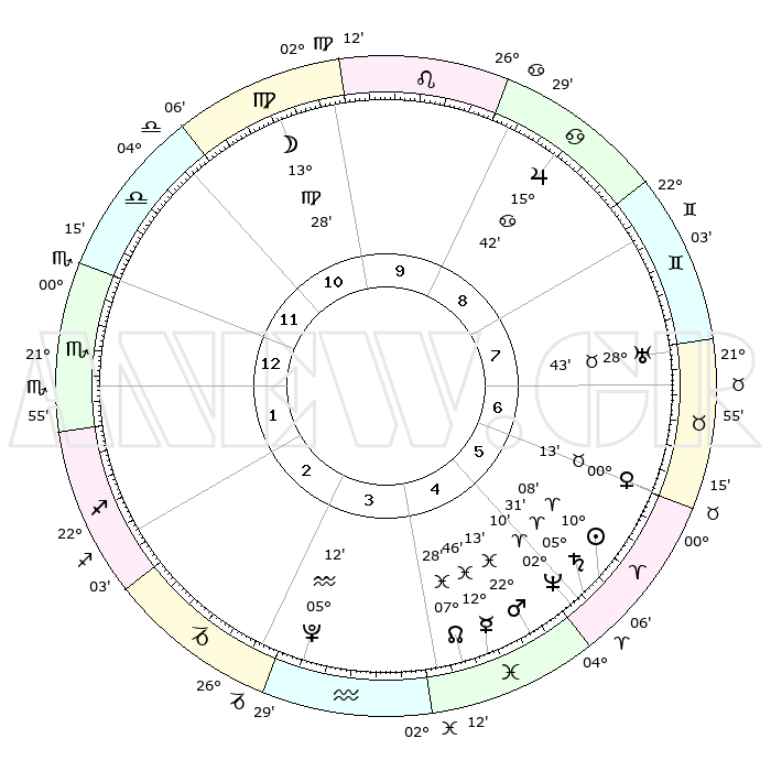 | | ΘΕΣΕΙΣ ΠΛΑΝΗΤΩΝ ΑΣΤΡΟΛΟΓΙΚΟΥ ΧΑΡΤΗ ΤΗΣ ΣΤΙΓΜΗΣ ΑΥΤΗΣ | | | | Πλανήτης | Ζώδιο | Μοίρες | Δεκαήμ. | Σε οίκο | Απόκλιση | | Ακμές των οίκων | | Ηλιος | Κριός | 10°05' | Δεύτερο | 5 | 03 N 59 | | 1ος | 05°25' | Σκορπιός | | Σελήνη | Παρθένος | 12°44' | Δεύτερο | 10 | 06 N 27 | | 2ος | 04°11' | Τοξότης | | Ερμής | Ιχθείς | 12°43' | Δεύτερο | 4 | 07 S 49 | | 3ος | 06°36' | Αιγόκερως | | Αφροδίτη | Ταύρος | 00°09' | Πρώτο | 6 | 11 N 04 | | 4ος | 11°11' | Υδροχόος | | Αρης | Ιχθείς | 22°11' | Τρίτο | 5 | 04 S 04 | | 5ος | 13°60' | Ιχθείς | | Δίας | Καρκίνος | 15°42' | Δεύτερο | 9 | 22 N 53 | | 6ος | 12°08' | Κριός | | Κρόνος | Κριός | 05°31' | Πρώτο | 5 | 00 N 14 | | 7ος | 05°25' | Ταύρος | | Ουρανός | Ταύρος | 28°43' | Τρίτο | 7 | 19 N 42 | | 8ος | 04°10' | Δίδυμοι | | Ποσειδώνας | Κριός | 02°10' | Πρώτο | 5 | 00 S 20 | | 9ος | 06°36' | Καρκίνος | | Πλούτωνας | Υδροχόος | 05°12' | Πρώτο | 3 | 22 S 47 | | 10ος | 11°11' | Λέων | | Β. Δεσμός | Ιχθείς | 07°28' | Πρώτο | 4 | 08 S 46 | | 11ος | 13°60' | Παρθένος | | Ωροσκόπος | Σκορπιός | 05°25' | Πρώτο | | | 12ος | 12°08' | Ζυγός | | Μεσουράνημα | Λέων | 11°11' | Δεύτερο | | | |