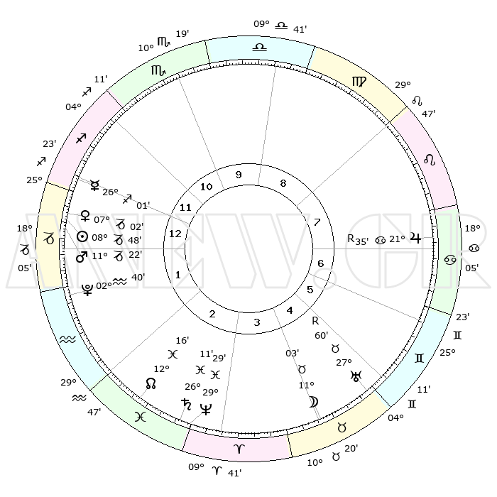| | ΘΕΣΕΙΣ ΠΛΑΝΗΤΩΝ ΑΣΤΡΟΛΟΓΙΚΟΥ ΧΑΡΤΗ ΤΗΣ ΣΤΙΓΜΗΣ ΑΥΤΗΣ | | | | Πλανήτης | Ζώδιο | Μοίρες | Δεκαήμ. | Σε οίκο | Απόκλιση | | Ακμές των οίκων | | Ηλιος | Αιγόκερως | 08°44' | Πρώτο | 1 | 23 S 09 | | 1ος | 23°08' | Τοξότης | | Σελήνη | Ταύρος | 10°00' | Δεύτερο | 4 | 18 N 56 | | 2ος | 28°37' | Αιγόκερως | | Ερμής | Τοξότης | 25°55' | Τρίτο | 1 | 23 S 44 | | 3ος | 07°57' | Ιχθείς | | Αφροδίτη | Αιγόκερως | 06°57' | Πρώτο | 1 | 23 S 41 | | 4ος | 12°52' | Κριός | | Αρης | Αιγόκερως | 11°19' | Δεύτερο | 1 | 23 S 50 | | 5ος | 10°19' | Ταύρος | | Δίας | Καρκίνος | 21°35'R | Τρίτο | 7 | 21 N 56 | | 6ος | 02°39' | Δίδυμοι | | Κρόνος | Ιχθείς | 26°11' | Τρίτο | 3 | 03 S 36 | | 7ος | 23°08' | Δίδυμοι | | Ουρανός | Ταύρος | 27°60'R | Τρίτο | 5 | 19 N 31 | | 8ος | 28°37' | Καρκίνος | | Ποσειδώνας | Ιχθείς | 29°29' | Τρίτο | 3 | 01 S 26 | | 9ος | 07°57' | Παρθένος | | Πλούτωνας | Υδροχόος | 02°40' | Πρώτο | 2 | 23 S 14 | | 10ος | 12°52' | Ζυγός | | Β. Δεσμός | Ιχθείς | 12°16' | Δεύτερο | 3 | 06 S 57 | | 11ος | 10°19' | Σκορπιός | | Ωροσκόπος | Τοξότης | 23°08' | Τρίτο | | | 12ος | 02°39' | Τοξότης | | Μεσουράνημα | Ζυγός | 12°52' | Δεύτερο | | | |
