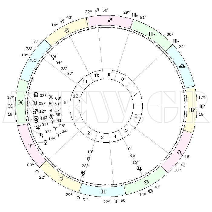 | | ΘΕΣΕΙΣ ΠΛΑΝΗΤΩΝ ΑΣΤΡΟΛΟΓΙΚΟΥ ΧΑΡΤΗ ΤΗΣ ΣΤΙΓΜΗΣ ΑΥΤΗΣ | | | | Πλανήτης | Ζώδιο | Μοίρες | Δεκαήμ. | Σε οίκο | Απόκλιση | | Ακμές των οίκων | | Ηλιος | Ιχθείς | 27°31' | Τρίτο | 1 | 00 S 59 | | 1ος | 12°12' | Υδροχόος | | Σελήνη | Ιχθείς | 15°20' | Δεύτερο | 1 | 05 S 14 | | 2ος | 27°44' | Ιχθείς | | Ερμής | Ιχθείς | 08°52'R | Πρώτο | 1 | 06 S 43 | | 3ος | 04°00' | Ταύρος | | Αφροδίτη | Κριός | 14°29' | Δεύτερο | 2 | 04 N 50 | | 4ος | 00°33' | Δίδυμοι | | Αρης | Ιχθείς | 12°14' | Δεύτερο | 1 | 07 S 58 | | 5ος | 22°37' | Δίδυμοι | | Δίας | Καρκίνος | 15°10' | Δεύτερο | 6 | 22 N 56 | | 6ος | 14°40' | Καρκίνος | | Κρόνος | Κριός | 03°56' | Πρώτο | 2 | 00 S 23 | | 7ος | 12°12' | Λέων | | Ουρανός | Ταύρος | 28°13' | Τρίτο | 3 | 19 N 35 | | 8ος | 27°44' | Παρθένος | | Ποσειδώνας | Κριός | 01°41' | Πρώτο | 2 | 00 S 32 | | 9ος | 04°00' | Σκορπιός | | Πλούτωνας | Υδροχόος | 04°57' | Πρώτο | 12 | 22 S 49 | | 10ος | 00°33' | Τοξότης | | Β. Δεσμός | Ιχθείς | 08°08' | Πρώτο | 1 | 08 S 31 | | 11ος | 22°37' | Τοξότης | | Ωροσκόπος | Υδροχόος | 12°12' | Δεύτερο | | | 12ος | 14°40' | Αιγόκερως | | Μεσουράνημα | Τοξότης | 00°33' | Πρώτο | | | |