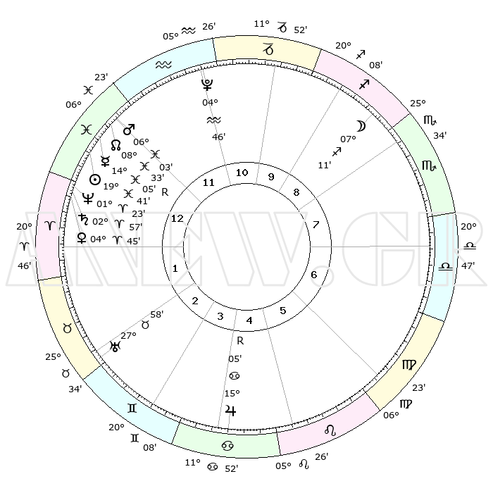 | | ΘΕΣΕΙΣ ΠΛΑΝΗΤΩΝ ΑΣΤΡΟΛΟΓΙΚΟΥ ΧΑΡΤΗ ΤΗΣ ΣΤΙΓΜΗΣ ΑΥΤΗΣ | | | | Πλανήτης | Ζώδιο | Μοίρες | Δεκαήμ. | Σε οίκο | Απόκλιση | | Ακμές των οίκων | | Ηλιος | Ιχθείς | 19°37' | Δεύτερο | 1 | 04 S 07 | | 1ος | 13°32' | Ιχθείς | | Σελήνη | Τοξότης | 06°26' | Πρώτο | 9 | 26 S 34 | | 2ος | 27°15' | Κριός | | Ερμής | Ιχθείς | 14°08'R | Δεύτερο | 1 | 03 S 08 | | 3ος | 27°24' | Ταύρος | | Αφροδίτη | Κριός | 04°40' | Πρώτο | 1 | 00 N 46 | | 4ος | 20°39' | Δίδυμοι | | Αρης | Ιχθείς | 05°60' | Πρώτο | 12 | 10 S 20 | | 5ος | 12°27' | Καρκίνος | | Δίας | Καρκίνος | 15°05'R | Δεύτερο | 5 | 22 N 56 | | 6ος | 07°33' | Λέων | | Κρόνος | Κριός | 02°57' | Πρώτο | 1 | 00 S 47 | | 7ος | 13°32' | Παρθένος | | Ουρανός | Ταύρος | 27°58' | Τρίτο | 3 | 19 N 32 | | 8ος | 27°15' | Ζυγός | | Ποσειδώνας | Κριός | 01°23' | Πρώτο | 1 | 00 S 39 | | 9ος | 27°24' | Σκορπιός | | Πλούτωνας | Υδροχόος | 04°46' | Πρώτο | 11 | 22 S 50 | | 10ος | 20°39' | Τοξότης | | Β. Δεσμός | Ιχθείς | 08°33' | Πρώτο | 12 | 08 S 22 | | 11ος | 12°27' | Αιγόκερως | | Ωροσκόπος | Ιχθείς | 13°32' | Δεύτερο | | | 12ος | 07°33' | Υδροχόος | | Μεσουράνημα | Τοξότης | 20°39' | Τρίτο | | | |