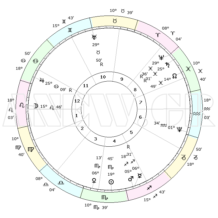 | | ΘΕΣΕΙΣ ΠΛΑΝΗΤΩΝ ΑΣΤΡΟΛΟΓΙΚΟΥ ΧΑΡΤΗ ΤΗΣ ΣΤΙΓΜΗΣ ΑΥΤΗΣ | | | | Πλανήτης | Ζώδιο | Μοίρες | Δεκαήμ. | Σε οίκο | Απόκλιση | | Ακμές των οίκων | | Ηλιος | Σκορπιός | 19°41' | Δεύτερο | 4 | 17 S 39 | | 1ος | 28°30' | Καρκίνος | | Σελήνη | Λέων | 14°52' | Δεύτερο | 1 | 18 N 54 | | 2ος | 19°26' | Λέων | | Ερμής | Τοξότης | 06°33'R | Πρώτο | 5 | 23 S 22 | | 3ος | 14°17' | Παρθένος | | Αφροδίτη | Σκορπιός | 06°08' | Πρώτο | 4 | 12 S 21 | | 4ος | 15°07' | Ζυγός | | Αρης | Τοξότης | 05°15' | Πρώτο | 5 | 21 S 40 | | 5ος | 21°12' | Σκορπιός | | Δίας | Καρκίνος | 25°09'R | Τρίτο | 12 | 21 N 12 | | 6ος | 27°09' | Τοξότης | | Κρόνος | Ιχθείς | 25°31'R | Τρίτο | 9 | 04 S 01 | | 7ος | 28°30' | Αιγόκερως | | Ουρανός | Ταύρος | 29°51'R | Τρίτο | 11 | 19 N 54 | | 8ος | 19°26' | Υδροχόος | | Ποσειδώνας | Ιχθείς | 29°36'R | Τρίτο | 9 | 01 S 25 | | 9ος | 14°17' | Ιχθείς | | Πλούτωνας | Υδροχόος | 01°34' | Πρώτο | 7 | 23 S 29 | | 10ος | 15°07' | Κριός | | Β. Δεσμός | Ιχθείς | 14°50' | Δεύτερο | 9 | 05 S 59 | | 11ος | 21°12' | Ταύρος | | Ωροσκόπος | Καρκίνος | 28°30' | Τρίτο | | | 12ος | 27°09' | Δίδυμοι | | Μεσουράνημα | Κριός | 15°07' | Δεύτερο | | | |