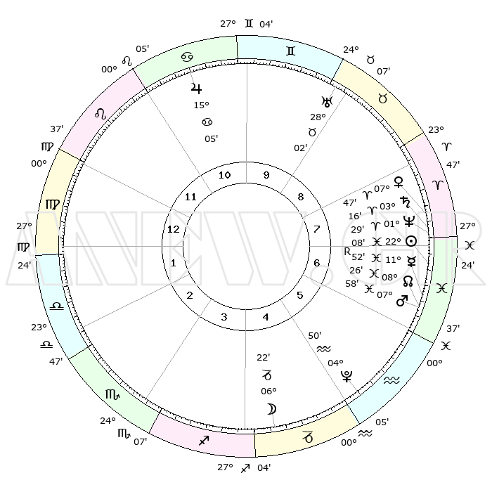 | | ΘΕΣΕΙΣ ΠΛΑΝΗΤΩΝ ΑΣΤΡΟΛΟΓΙΚΟΥ ΧΑΡΤΗ ΤΗΣ ΣΤΙΓΜΗΣ ΑΥΤΗΣ | | | | Πλανήτης | Ζώδιο | Μοίρες | Δεκαήμ. | Σε οίκο | Απόκλιση | | Ακμές των οίκων | | Ηλιος | Ιχθείς | 22°04' | Τρίτο | 7 | 03 S 09 | | 1ος | 08°48' | Παρθένος | | Σελήνη | Αιγόκερως | 05°36' | Πρώτο | 4 | 28 S 01 | | 2ος | 03°34' | Ζυγός | | Ερμής | Ιχθείς | 11°55'R | Δεύτερο | 7 | 04 S 23 | | 3ος | 02°56' | Σκορπιός | | Αφροδίτη | Κριός | 07°42' | Πρώτο | 8 | 02 N 02 | | 4ος | 05°53' | Τοξότης | | Αρης | Ιχθείς | 07°55' | Πρώτο | 6 | 09 S 36 | | 5ος | 09°33' | Αιγόκερως | | Δίας | Καρκίνος | 15°05' | Δεύτερο | 11 | 22 N 56 | | 6ος | 10°54' | Υδροχόος | | Κρόνος | Κριός | 03°15' | Πρώτο | 7 | 00 S 39 | | 7ος | 08°48' | Ιχθείς | | Ουρανός | Ταύρος | 28°02' | Τρίτο | 9 | 19 N 33 | | 8ος | 03°34' | Κριός | | Ποσειδώνας | Κριός | 01°29' | Πρώτο | 7 | 00 S 37 | | 9ος | 02°56' | Ταύρος | | Πλούτωνας | Υδροχόος | 04°50' | Πρώτο | 5 | 22 S 50 | | 10ος | 05°53' | Δίδυμοι | | Β. Δεσμός | Ιχθείς | 08°26' | Πρώτο | 6 | 08 S 24 | | 11ος | 09°33' | Καρκίνος | | Ωροσκόπος | Παρθένος | 08°48' | Πρώτο | | | 12ος | 10°54' | Λέων | | Μεσουράνημα | Δίδυμοι | 05°53' | Πρώτο | | | |