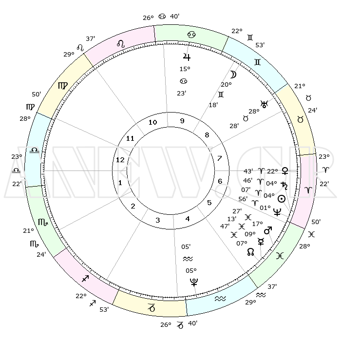 | | ΘΕΣΕΙΣ ΠΛΑΝΗΤΩΝ ΑΣΤΡΟΛΟΓΙΚΟΥ ΧΑΡΤΗ ΤΗΣ ΣΤΙΓΜΗΣ ΑΥΤΗΣ | | | | Πλανήτης | Ζώδιο | Μοίρες | Δεκαήμ. | Σε οίκο | Απόκλιση | | Ακμές των οίκων | | Ηλιος | Κριός | 04°03' | Πρώτο | 6 | 01 N 37 | | 1ος | 05°01' | Ζυγός | | Σελήνη | Δίδυμοι | 19°24' | Δεύτερο | 9 | 28 N 08 | | 2ος | 01°57' | Σκορπιός | | Ερμής | Ιχθείς | 09°12' | Πρώτο | 6 | 08 S 03 | | 3ος | 02°34' | Τοξότης | | Αφροδίτη | Κριός | 22°39' | Τρίτο | 7 | 08 N 08 | | 4ος | 05°38' | Αιγόκερως | | Αρης | Ιχθείς | 17°24' | Δεύτερο | 6 | 05 S 57 | | 5ος | 08°34' | Υδροχόος | | Δίας | Καρκίνος | 15°23' | Δεύτερο | 10 | 22 N 55 | | 6ος | 08°48' | Ιχθείς | | Κρόνος | Κριός | 04°45' | Πρώτο | 6 | 00 S 04 | | 7ος | 05°01' | Κριός | | Ουρανός | Ταύρος | 28°28' | Τρίτο | 8 | 19 N 39 | | 8ος | 01°57' | Ταύρος | | Ποσειδώνας | Κριός | 01°56' | Πρώτο | 6 | 00 S 26 | | 9ος | 02°34' | Δίδυμοι | | Πλούτωνας | Υδροχόος | 05°05' | Πρώτο | 4 | 22 S 48 | | 10ος | 05°38' | Καρκίνος | | Β. Δεσμός | Ιχθείς | 07°47' | Πρώτο | 5 | 08 S 39 | | 11ος | 08°34' | Λέων | | Ωροσκόπος | Ζυγός | 05°01' | Πρώτο | | | 12ος | 08°48' | Παρθένος | | Μεσουράνημα | Καρκίνος | 05°38' | Πρώτο | | | |