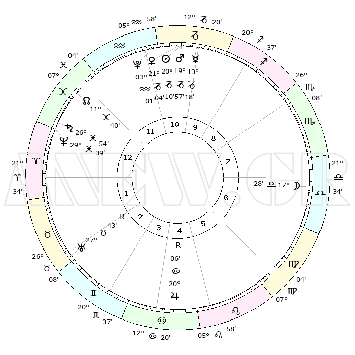| | ΘΕΣΕΙΣ ΠΛΑΝΗΤΩΝ ΑΣΤΡΟΛΟΓΙΚΟΥ ΧΑΡΤΗ ΤΗΣ ΣΤΙΓΜΗΣ ΑΥΤΗΣ | | | | Πλανήτης | Ζώδιο | Μοίρες | Δεκαήμ. | Σε οίκο | Απόκλιση | | Ακμές των οίκων | | Ηλιος | Αιγόκερως | 19°45' | Δεύτερο | 3 | 21 S 59 | | 1ος | 08°56' | Σκορπιός | | Σελήνη | Ζυγός | 12°33' | Δεύτερο | 11 | 07 S 29 | | 2ος | 07°56' | Τοξότης | | Ερμής | Αιγόκερως | 12°40' | Δεύτερο | 3 | 24 S 16 | | 3ος | 10°43' | Αιγόκερως | | Αφροδίτη | Αιγόκερως | 20°33' | Τρίτο | 3 | 22 S 40 | | 4ος | 15°33' | Υδροχόος | | Αρης | Αιγόκερως | 19°38' | Δεύτερο | 3 | 22 S 56 | | 5ος | 18°15' | Ιχθείς | | Δίας | Καρκίνος | 20°09'R | Τρίτο | 9 | 22 N 11 | | 6ος | 16°01' | Κριός | | Κρόνος | Ιχθείς | 26°52' | Τρίτο | 5 | 03 S 18 | | 7ος | 08°56' | Ταύρος | | Ουρανός | Ταύρος | 27°44'R | Τρίτο | 7 | 19 N 27 | | 8ος | 07°56' | Δίδυμοι | | Ποσειδώνας | Ιχθείς | 29°39' | Τρίτο | 5 | 01 S 22 | | 9ος | 10°43' | Καρκίνος | | Πλούτωνας | Υδροχόος | 03°00' | Πρώτο | 3 | 23 S 10 | | 10ος | 15°33' | Λέων | | Β. Δεσμός | Ιχθείς | 11°42' | Δεύτερο | 4 | 07 S 11 | | 11ος | 18°15' | Παρθένος | | Ωροσκόπος | Σκορπιός | 08°56' | Πρώτο | | | 12ος | 16°01' | Ζυγός | | Μεσουράνημα | Λέων | 15°33' | Δεύτερο | | | |
