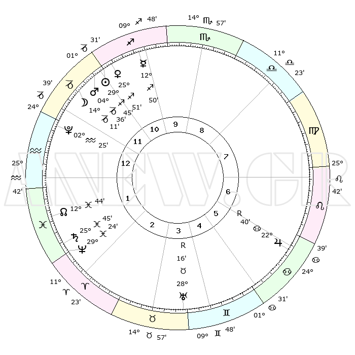 | | ΘΕΣΕΙΣ ΠΛΑΝΗΤΩΝ ΑΣΤΡΟΛΟΓΙΚΟΥ ΧΑΡΤΗ ΤΗΣ ΣΤΙΓΜΗΣ ΑΥΤΗΣ | | | | Πλανήτης | Ζώδιο | Μοίρες | Δεκαήμ. | Σε οίκο | Απόκλιση | | Ακμές των οίκων | | Ηλιος | Τοξότης | 29°41' | Τρίτο | 11 | 23 S 26 | | 1ος | 25°57' | Αιγόκερως | | Σελήνη | Αιγόκερως | 13°24' | Δεύτερο | 12 | 27 S 00 | | 2ος | 09°20' | Ιχθείς | | Ερμής | Τοξότης | 12°44' | Δεύτερο | 11 | 21 S 36 | | 3ος | 18°22' | Κριός | | Αφροδίτη | Τοξότης | 25°46' | Τρίτο | 11 | 23 S 27 | | 4ος | 17°33' | Ταύρος | | Αρης | Αιγόκερως | 04°33' | Πρώτο | 12 | 24 S 10 | | 5ος | 10°38' | Δίδυμοι | | Δίας | Καρκίνος | 22°41'R | Τρίτο | 6 | 21 N 44 | | 6ος | 01°56' | Καρκίνος | | Κρόνος | Ιχθείς | 25°45' | Τρίτο | 2 | 03 S 48 | | 7ος | 25°57' | Καρκίνος | | Ουρανός | Ταύρος | 28°16'R | Τρίτο | 4 | 19 N 34 | | 8ος | 09°20' | Παρθένος | | Ποσειδώνας | Ιχθείς | 29°24' | Τρίτο | 2 | 01 S 28 | | 9ος | 18°22' | Ζυγός | | Πλούτωνας | Υδροχόος | 02°25' | Πρώτο | 1 | 23 S 17 | | 10ος | 17°33' | Σκορπιός | | Β. Δεσμός | Ιχθείς | 12°44' | Δεύτερο | 2 | 06 S 47 | | 11ος | 10°38' | Τοξότης | | Ωροσκόπος | Αιγόκερως | 25°57' | Τρίτο | | | 12ος | 01°56' | Αιγόκερως | | Μεσουράνημα | Σκορπιός | 17°33' | Δεύτερο | | | |