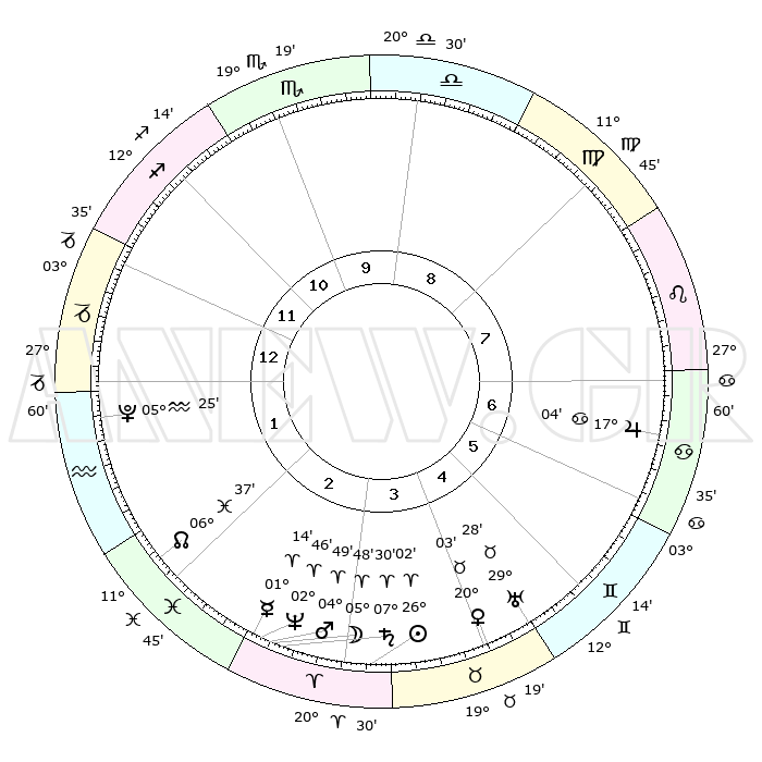| | ΘΕΣΕΙΣ ΠΛΑΝΗΤΩΝ ΑΣΤΡΟΛΟΓΙΚΟΥ ΧΑΡΤΗ ΤΗΣ ΣΤΙΓΜΗΣ ΑΥΤΗΣ | | | | Πλανήτης | Ζώδιο | Μοίρες | Δεκαήμ. | Σε οίκο | Απόκλιση | | Ακμές των οίκων | | Ηλιος | Κριός | 25°57' | Τρίτο | 4 | 10 N 01 | | 1ος | 01°54' | Αιγόκερως | | Σελήνη | Κριός | 04°49' | Πρώτο | 3 | 04 N 02 | | 2ος | 09°32' | Υδροχόος | | Ερμής | Κριός | 01°08' | Πρώτο | 3 | 01 S 57 | | 3ος | 19°39' | Ιχθείς | | Αφροδίτη | Ταύρος | 19°58' | Δεύτερο | 5 | 17 N 56 | | 4ος | 23°17' | Κριός | | Αρης | Κριός | 04°46' | Πρώτο | 3 | 01 N 00 | | 5ος | 19°18' | Ταύρος | | Δίας | Καρκίνος | 17°04' | Δεύτερο | 7 | 22 N 43 | | 6ος | 10°59' | Δίδυμοι | | Κρόνος | Κριός | 07°30' | Πρώτο | 3 | 01 N 00 | | 7ος | 01°54' | Καρκίνος | | Ουρανός | Ταύρος | 29°28' | Τρίτο | 5 | 19 N 52 | | 8ος | 09°32' | Λέων | | Ποσειδώνας | Κριός | 02°45' | Πρώτο | 3 | 00 S 07 | | 9ος | 19°39' | Παρθένος | | Πλούτωνας | Υδροχόος | 05°25' | Πρώτο | 1 | 22 S 47 | | 10ος | 23°17' | Ζυγός | | Β. Δεσμός | Ιχθείς | 06°37' | Πρώτο | 2 | 09 S 05 | | 11ος | 19°18' | Σκορπιός | | Ωροσκόπος | Αιγόκερως | 01°54' | Πρώτο | | | 12ος | 10°59' | Τοξότης | | Μεσουράνημα | Ζυγός | 23°17' | Τρίτο | | | |