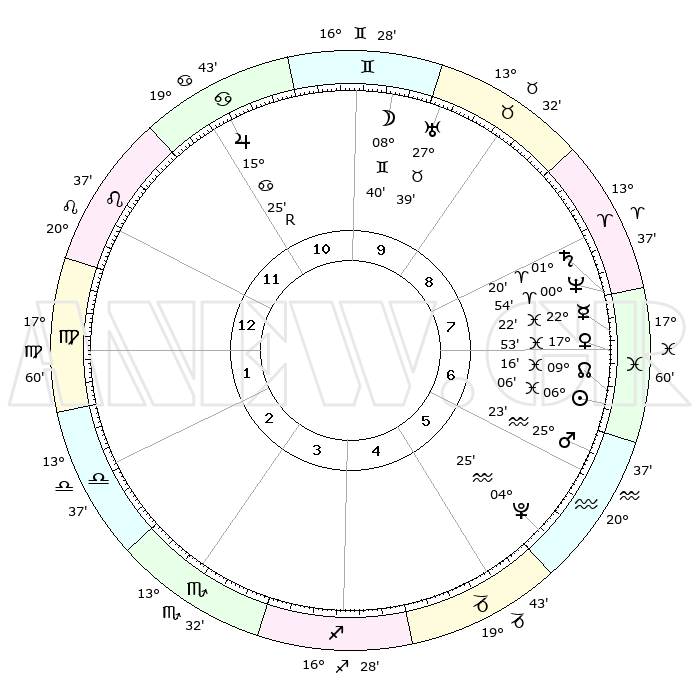 | | ΘΕΣΕΙΣ ΠΛΑΝΗΤΩΝ ΑΣΤΡΟΛΟΓΙΚΟΥ ΧΑΡΤΗ ΤΗΣ ΣΤΙΓΜΗΣ ΑΥΤΗΣ | | | | Πλανήτης | Ζώδιο | Μοίρες | Δεκαήμ. | Σε οίκο | Απόκλιση | | Ακμές των οίκων | | Ηλιος | Ιχθείς | 06°02' | Πρώτο | 7 | 09 S 18 | | 1ος | 29°54' | Λέων | | Σελήνη | Δίδυμοι | 07°47' | Πρώτο | 10 | 26 N 49 | | 2ος | 23°45' | Παρθένος | | Ερμής | Ιχθείς | 22°21' | Τρίτο | 7 | 00 S 49 | | 3ος | 22°25' | Ζυγός | | Αφροδίτη | Ιχθείς | 17°48' | Δεύτερο | 7 | 06 S 07 | | 4ος | 25°20' | Σκορπιός | | Αρης | Υδροχόος | 25°20' | Τρίτο | 6 | 14 S 06 | | 5ος | 29°32' | Τοξότης | | Δίας | Καρκίνος | 15°26'R | Δεύτερο | 11 | 22 N 53 | | 6ος | 01°29' | Υδροχόος | | Κρόνος | Κριός | 01°20' | Πρώτο | 8 | 01 S 26 | | 7ος | 29°54' | Υδροχόος | | Ουρανός | Ταύρος | 27°39' | Τρίτο | 10 | 19 N 27 | | 8ος | 23°45' | Ιχθείς | | Ποσειδώνας | Κριός | 00°54' | Πρώτο | 8 | 00 S 51 | | 9ος | 22°25' | Κριός | | Πλούτωνας | Υδροχόος | 04°25' | Πρώτο | 6 | 22 S 54 | | 10ος | 25°20' | Ταύρος | | Β. Δεσμός | Ιχθείς | 09°16' | Πρώτο | 7 | 08 S 05 | | 11ος | 29°32' | Δίδυμοι | | Ωροσκόπος | Λέων | 29°54' | Τρίτο | | | 12ος | 01°29' | Λέων | | Μεσουράνημα | Ταύρος | 25°20' | Τρίτο | | | |
