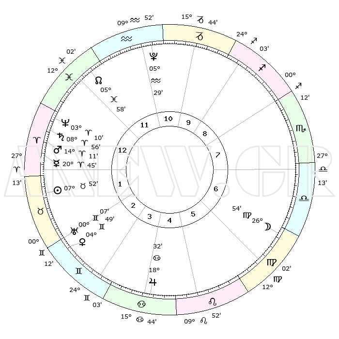 | | ΘΕΣΕΙΣ ΠΛΑΝΗΤΩΝ ΑΣΤΡΟΛΟΓΙΚΟΥ ΧΑΡΤΗ ΤΗΣ ΣΤΙΓΜΗΣ ΑΥΤΗΣ | | | | Πλανήτης | Ζώδιο | Μοίρες | Δεκαήμ. | Σε οίκο | Απόκλιση | | Ακμές των οίκων | | Ηλιος | Ταύρος | 07°48' | Πρώτο | 2 | 14 N 06 | | 1ος | 19°01' | Ιχθείς | | Σελήνη | Παρθένος | 26°04' | Τρίτο | 7 | 00 N 04 | | 2ος | 01°44' | Ταύρος | | Ερμής | Κριός | 20°38' | Τρίτο | 1 | 06 N 00 | | 3ος | 00°55' | Δίδυμοι | | Αφροδίτη | Δίδυμοι | 04°45' | Πρώτο | 3 | 21 N 50 | | 4ος | 23°49' | Δίδυμοι | | Αρης | Κριός | 14°08' | Δεύτερο | 1 | 04 N 44 | | 5ος | 15°43' | Καρκίνος | | Δίας | Καρκίνος | 18°31' | Δεύτερο | 5 | 22 N 32 | | 6ος | 11°33' | Λέων | | Κρόνος | Κριός | 08°56' | Πρώτο | 1 | 01 N 33 | | 7ος | 19°01' | Παρθένος | | Ουρανός | Δίδυμοι | 00°07' | Πρώτο | 2 | 20 N 00 | | 8ος | 01°44' | Σκορπιός | | Ποσειδώνας | Κριός | 03°10' | Πρώτο | 1 | 00 N 03 | | 9ος | 00°55' | Τοξότης | | Πλούτωνας | Υδροχόος | 05°29' | Πρώτο | 11 | 22 S 48 | | 10ος | 23°49' | Τοξότης | | Β. Δεσμός | Ιχθείς | 05°58' | Πρώτο | 12 | 09 S 19 | | 11ος | 15°43' | Αιγόκερως | | Ωροσκόπος | Ιχθείς | 19°01' | Δεύτερο | | | 12ος | 11°33' | Υδροχόος | | Μεσουράνημα | Τοξότης | 23°49' | Τρίτο | | | |